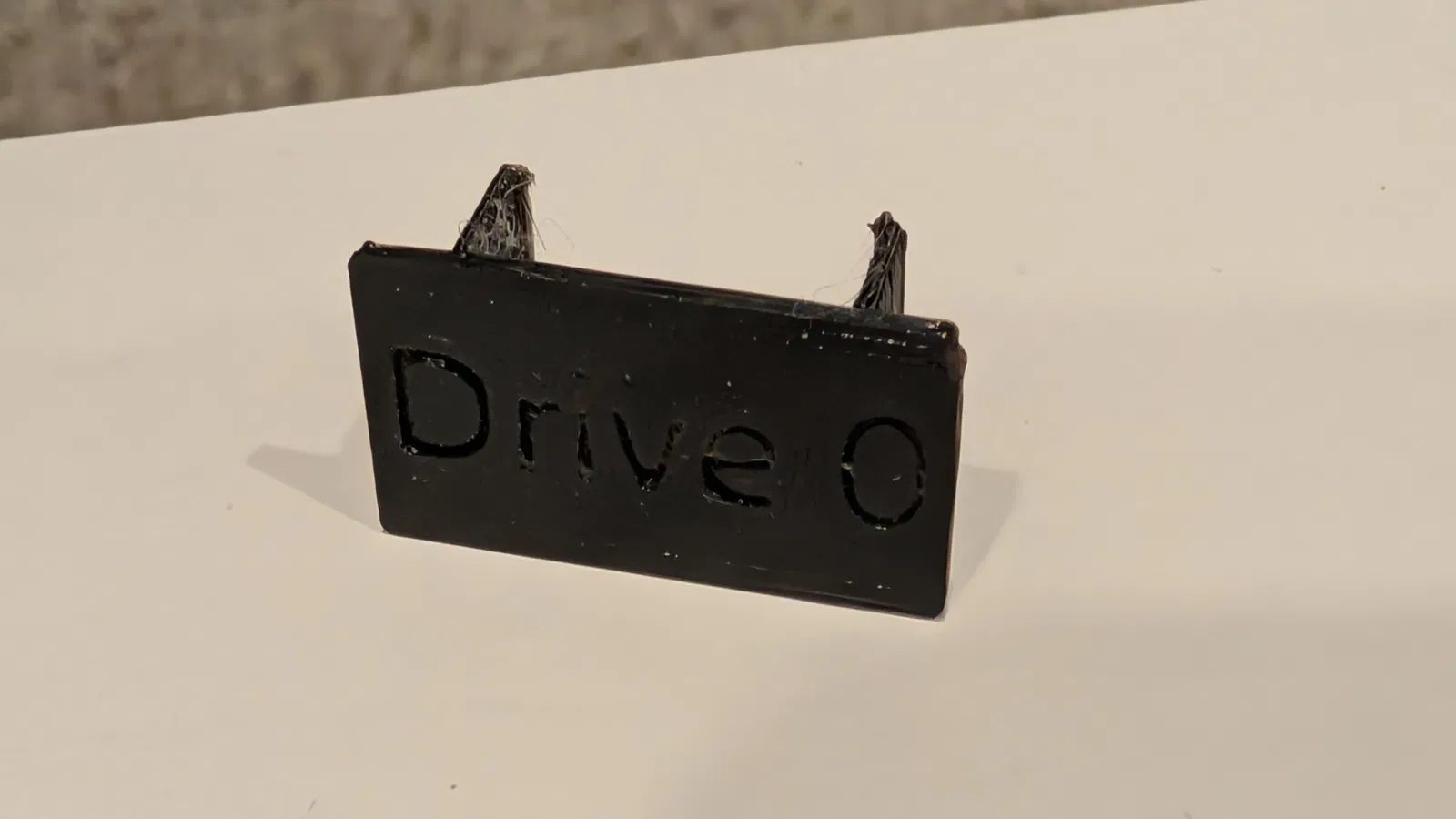 Mẫu nhãn (tag) bề ngang một khe dành cho caddy Dell Server 3.5". Có thể emboss chữ bằng cách thêm negative-volume trong PrusaSlicer; khuyến nghị độ sâu 0.5mm. In không cần supports và không dùng infill.