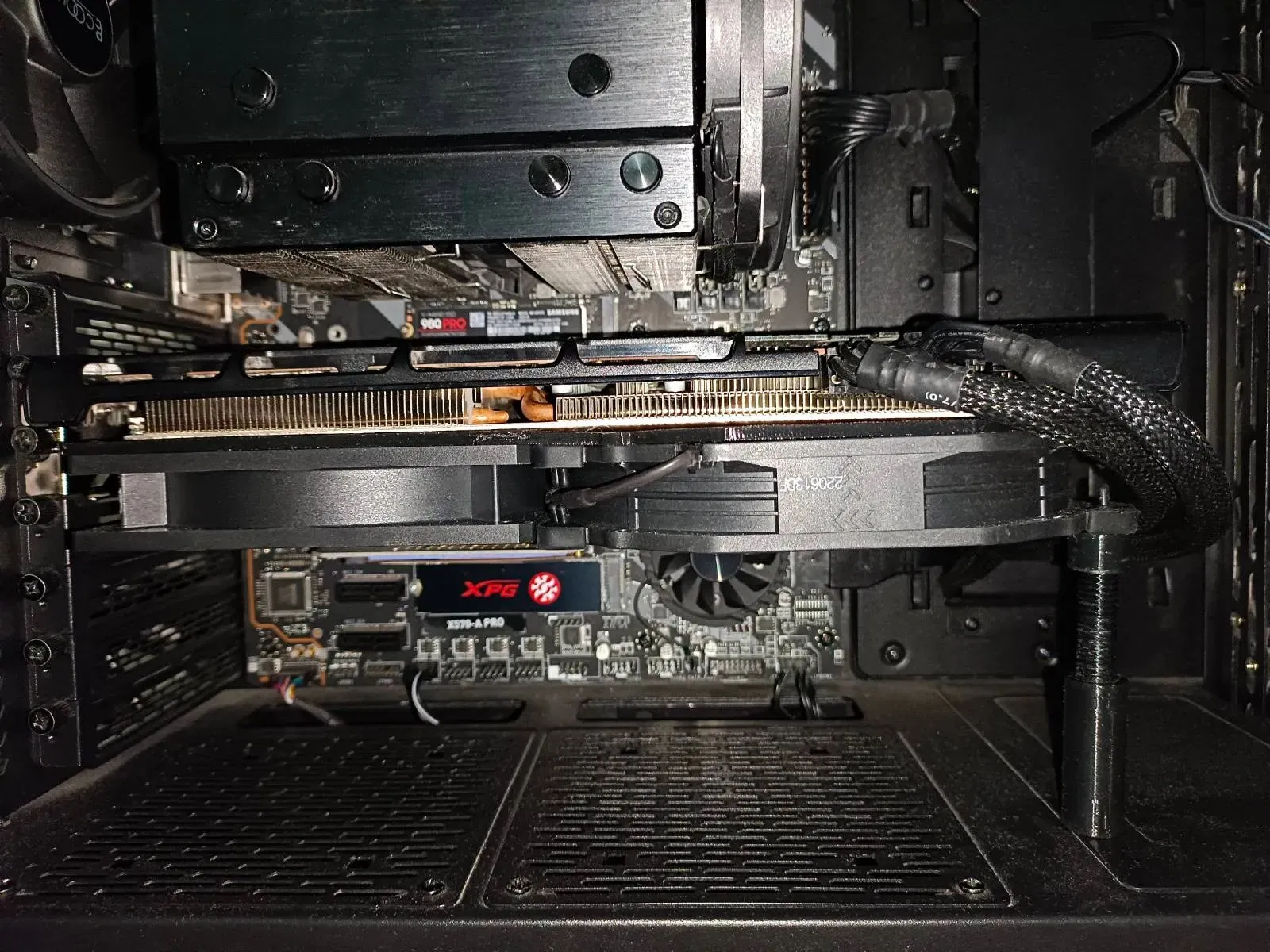 Vì bộ làm mát XFX Thicc III chỉ có lỗ vít ở hai đầu ngoài và không có ở giữa, tôi đã bao gồm một cái kẹp nhỏ để ngăn giữa giá đỡ bị võng do trọng lượng của các quạt.