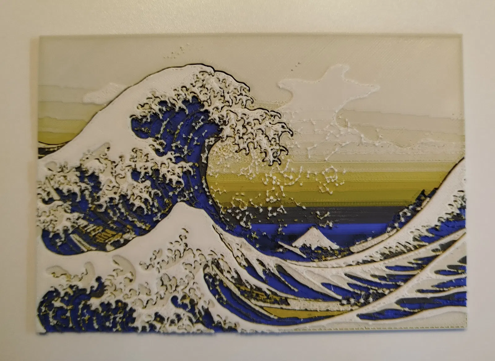 Phiên bản Hueforge đa màu của The Great Wave off Kanagawa. Hướng dẫn in chi tiết: 100% infill, layer height 0.08mm, kích thước 150x103.47mm, dùng 5 PLA và các mốc đổi màu theo layer.