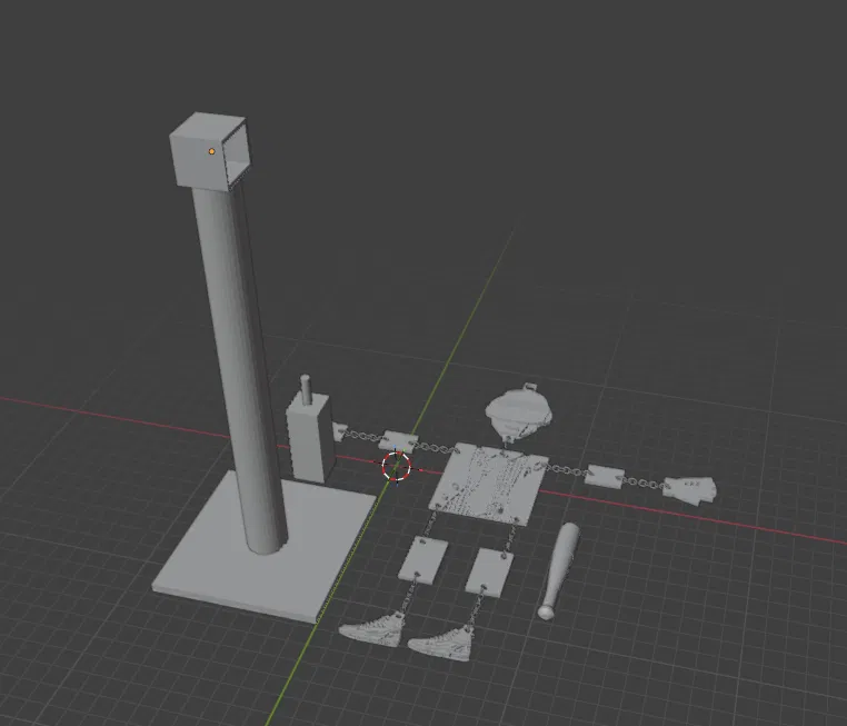 Mô hình clanker in 3D này được thiết kế như một món trưng bày cơ khí treo lơ lửng. Phần thân và đầu là khối trung tâm, có nhiều chi tiết kiểu giáp sắc cạnh, bu-lông, đường ghép panel và bề mặt cơ khí lộ thiên. Thay vì tay chân truyền thống, các đoạn xích nặng nối từ thân ra các bàn tay và bàn chân rời, tạo hiệu ứng treo kiểu rigidbody khi lắp hoàn chỉnh.