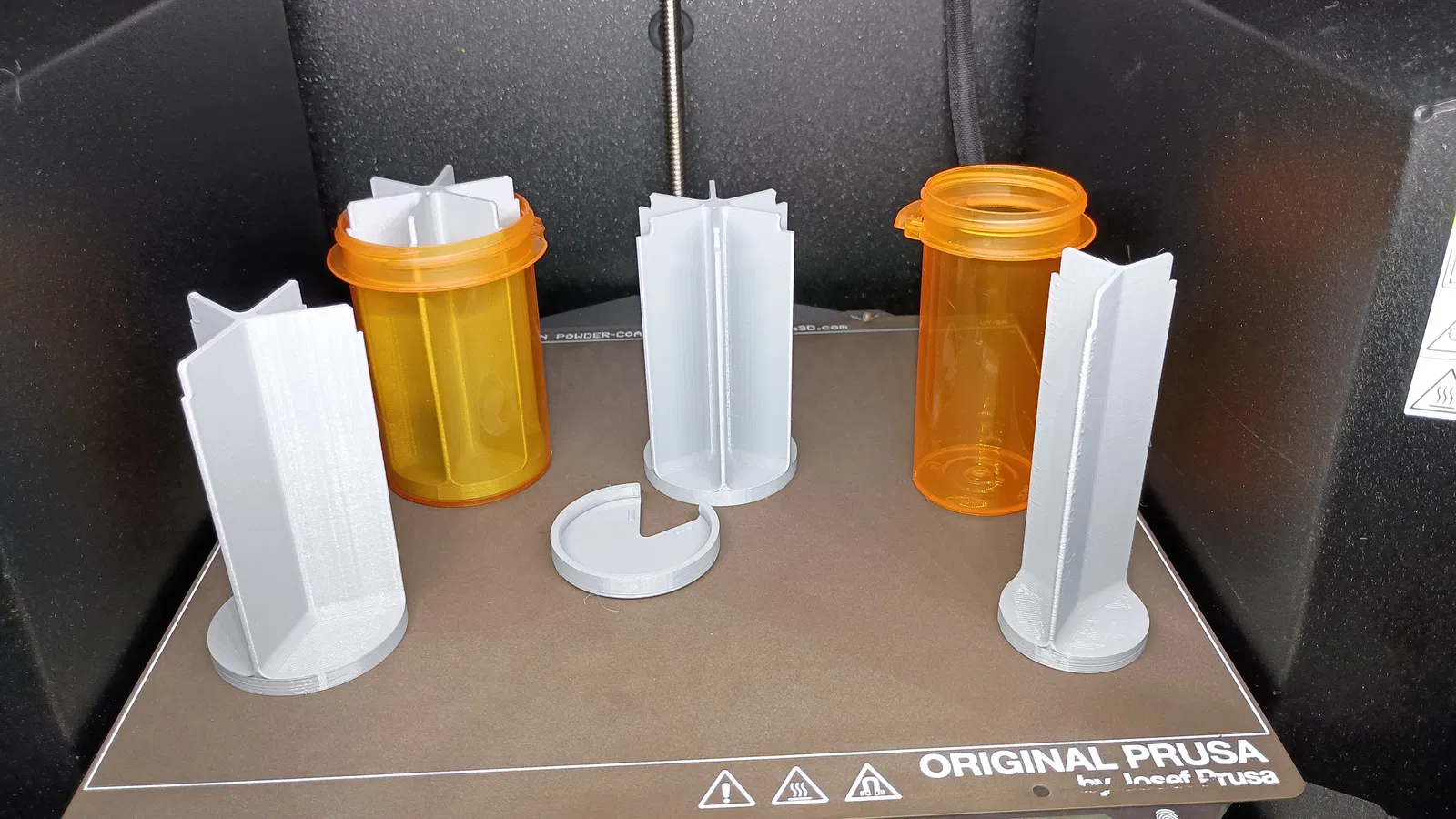 Mình dùng supports từ build plate בלבד, để lấp phần khoang rỗng bên dưới (khớp theo hình chai). Các vách ngăn có độ thuôn (tapered) và cao đúng bằng phần nắp. Mấy viên nhỏ xíu cũng không lọt qua các vách ngăn không che nắp. Mình chưa chắc việc rót những viên cực nhỏ với nắp che (có khe hở 1.5mm) sẽ ổn tới đâu. Nắp rót có snap-fit nhẹ, nhưng thiết kế là để bạn giữ bằng ngón cái trong lúc lắc cho viên thuốc rơi ra.