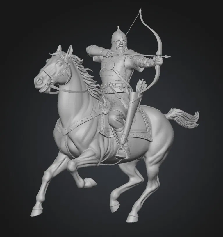Mẫu 3D “Kỵ sĩ Nga cưỡi ngựa với cung” khắc họa một chiến binh/hiệp sĩ Nga thời lịch sử trong tư thế cưỡi ngựa, tay cầm cung như một cung thủ. Phù hợp để sưu tầm, trưng bày hoặc in 3D.