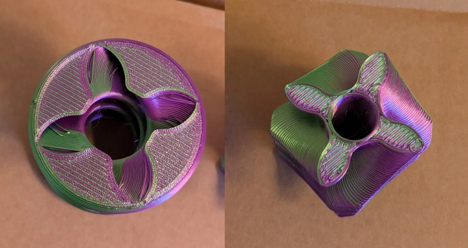 Mẫu pass-through kiểu “impossible” với Square Inner và Round Outer: chốt vuông trượt xuyên qua lỗ tròn dễ theo một chiều, nhưng chiều ngược lại sẽ kẹt trừ khi lật đầu. Gợi ý in: PLA, layer 0.3–0.35mm.