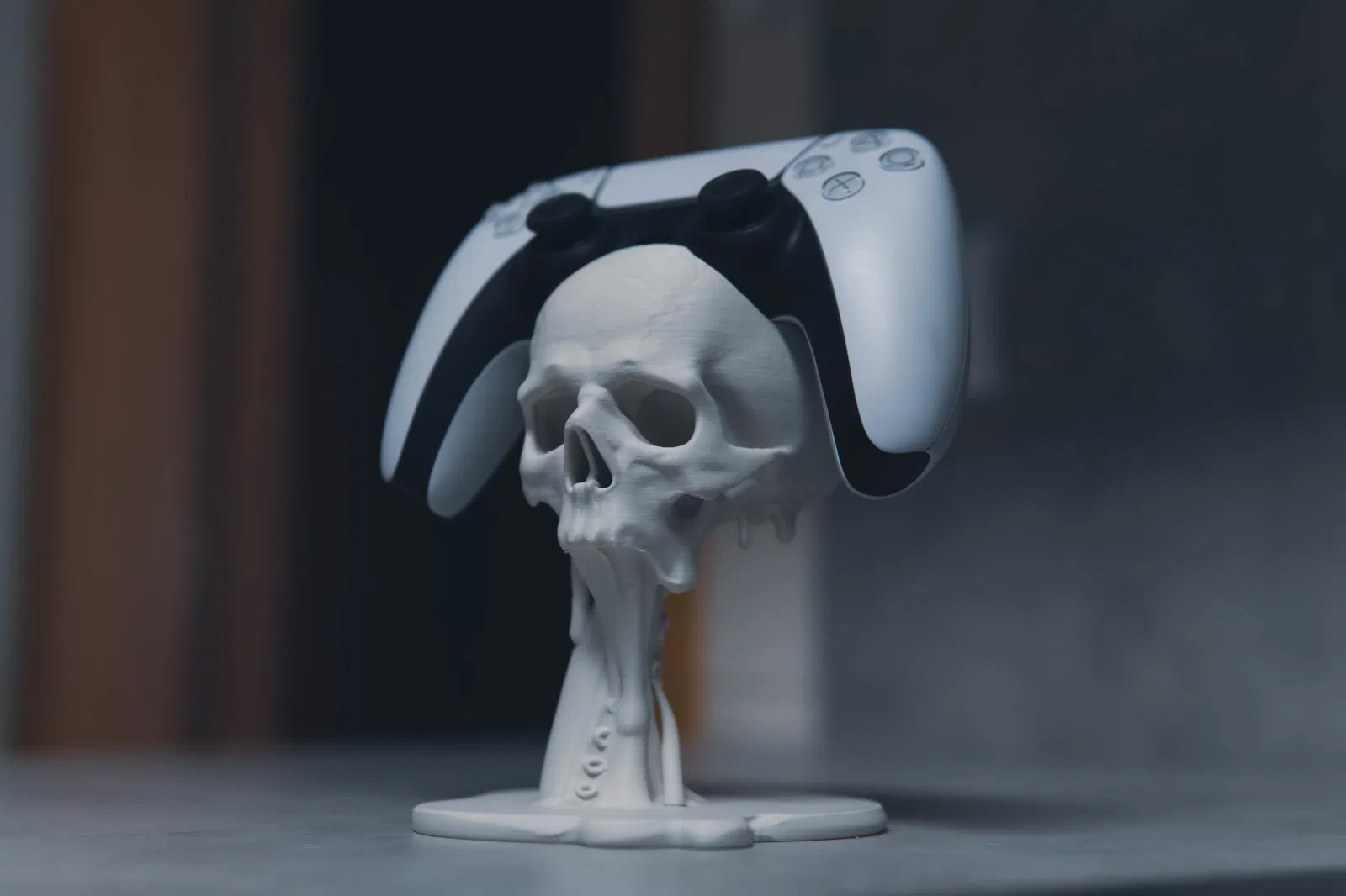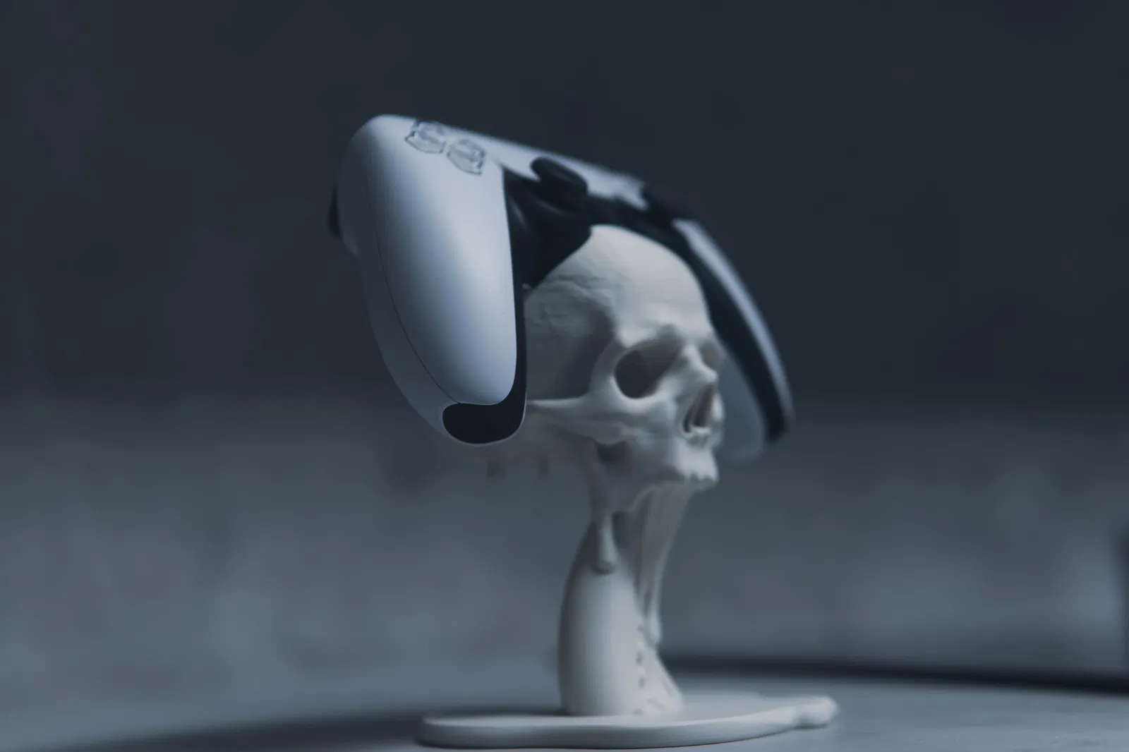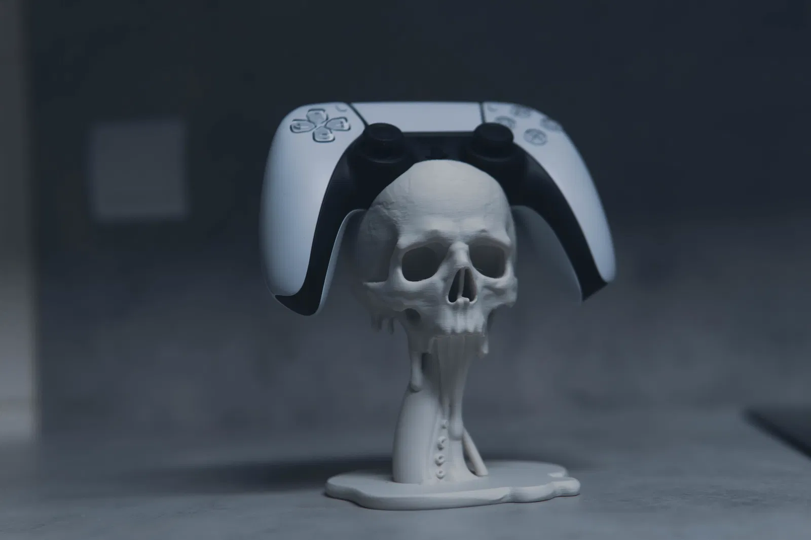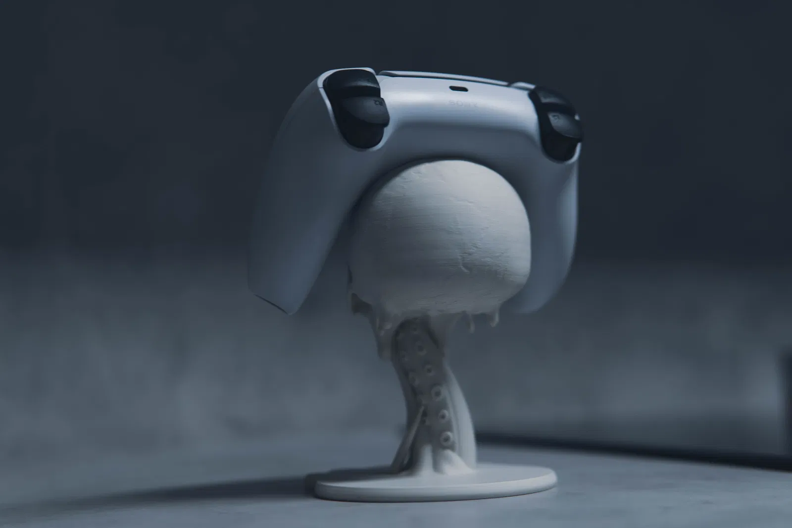 Giá đỡ tay cầm PS5 kiểu floating với đầu lâu và xúc tu tan chảy, đậm chất gothic horror. Trưng bày cực ngầu, làm điểm nhấn cho gaming setup. Tay cầm khác vẫn dùng được nhưng không khít bằng PS5.