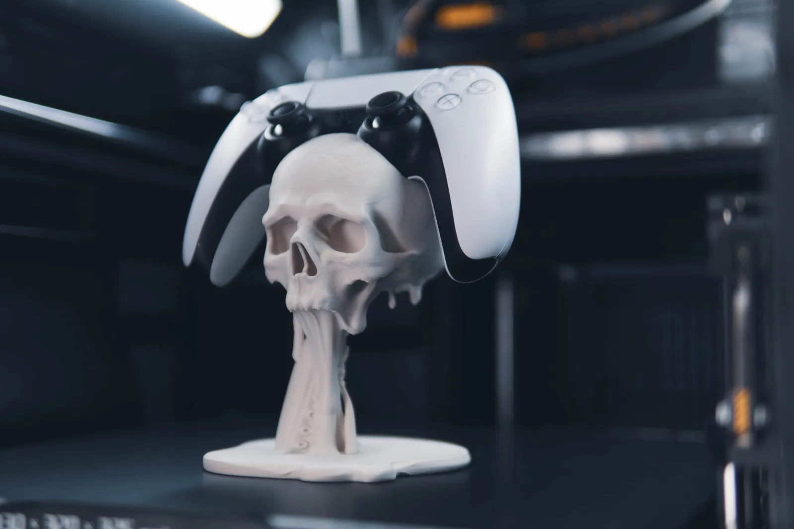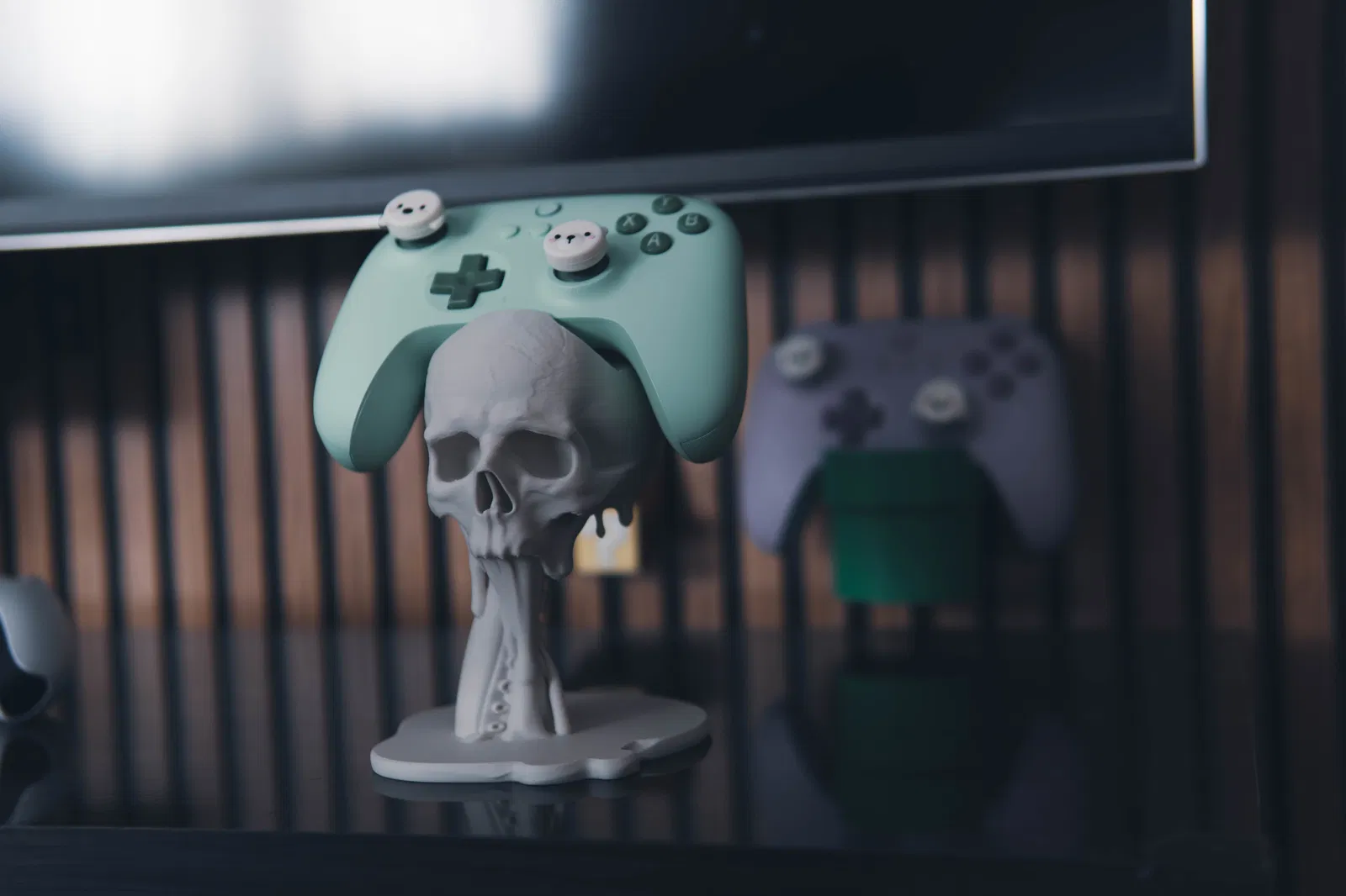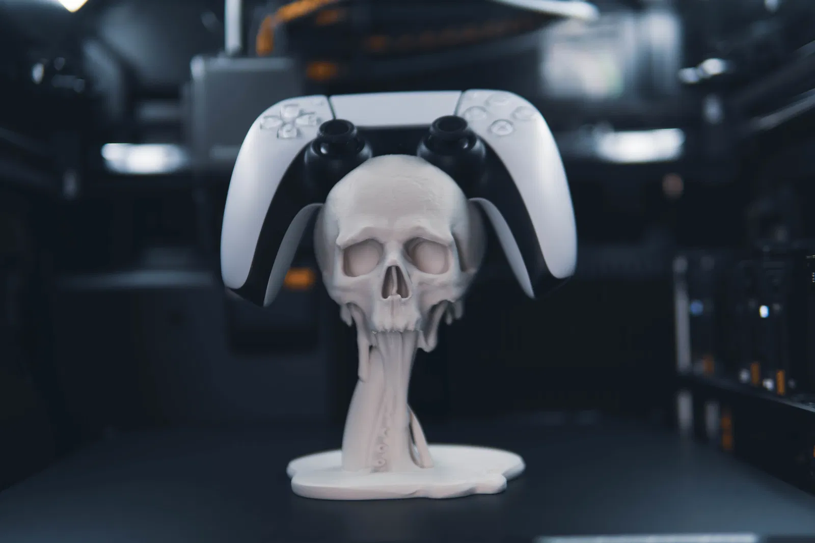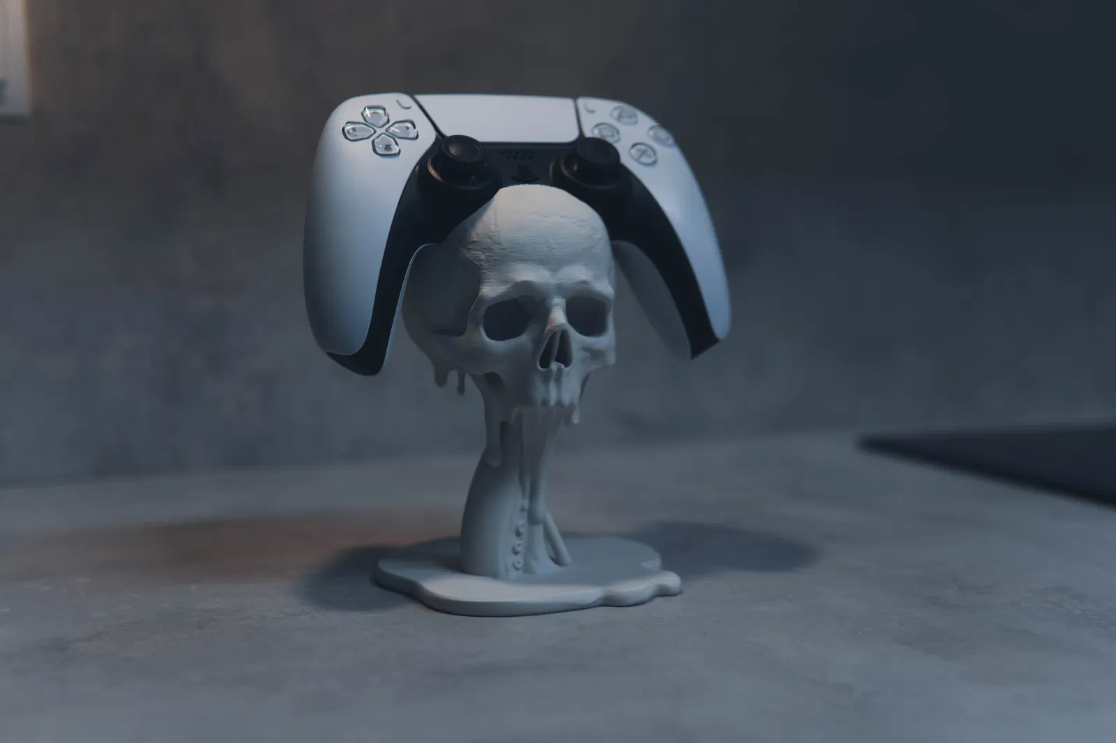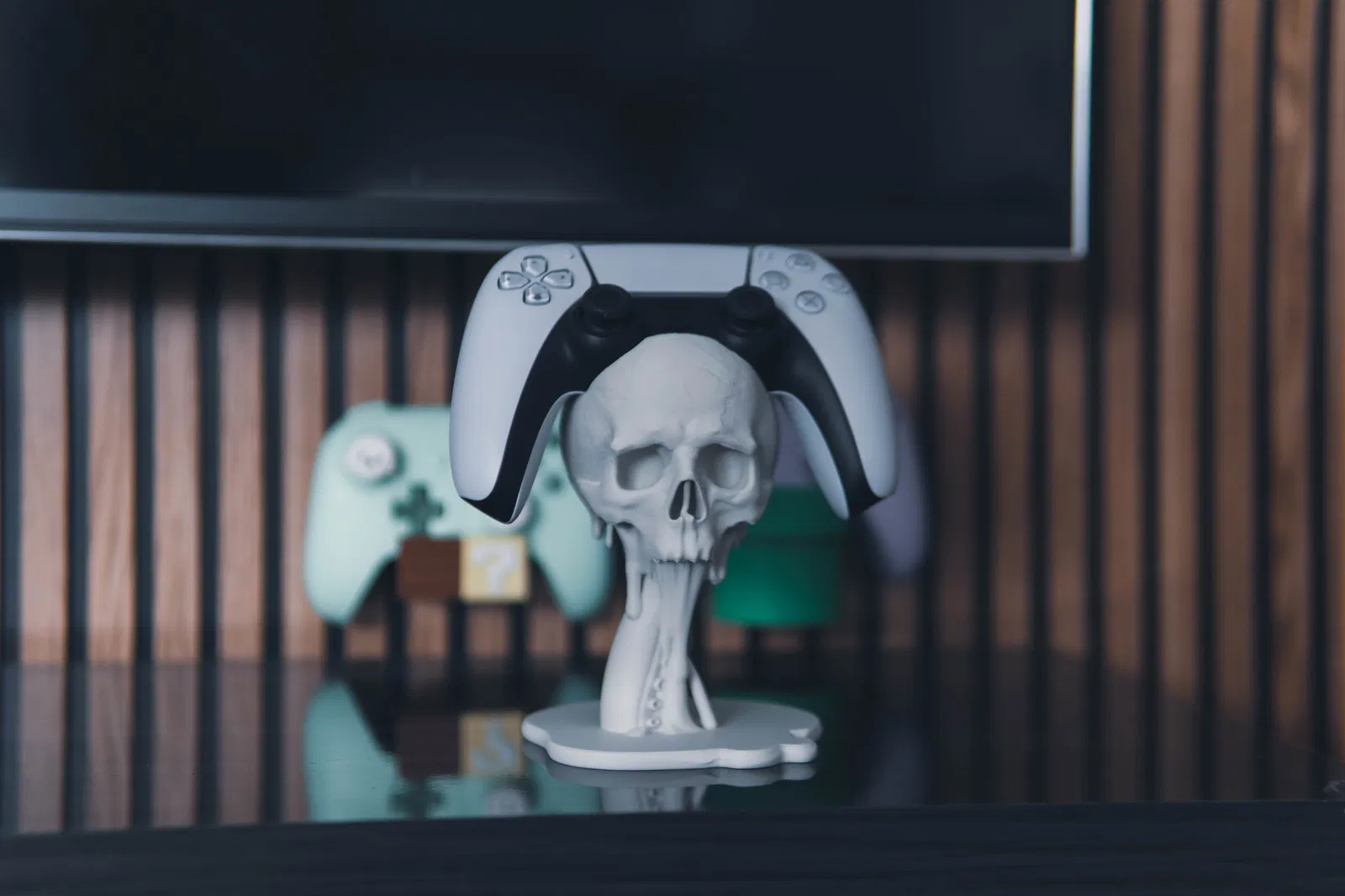 Giá đỡ tay cầm PS5 kiểu floating với đầu lâu và xúc tu tan chảy, đậm chất gothic horror. Trưng bày cực ngầu, làm điểm nhấn cho gaming setup. Tay cầm khác vẫn dùng được nhưng không khít bằng PS5.