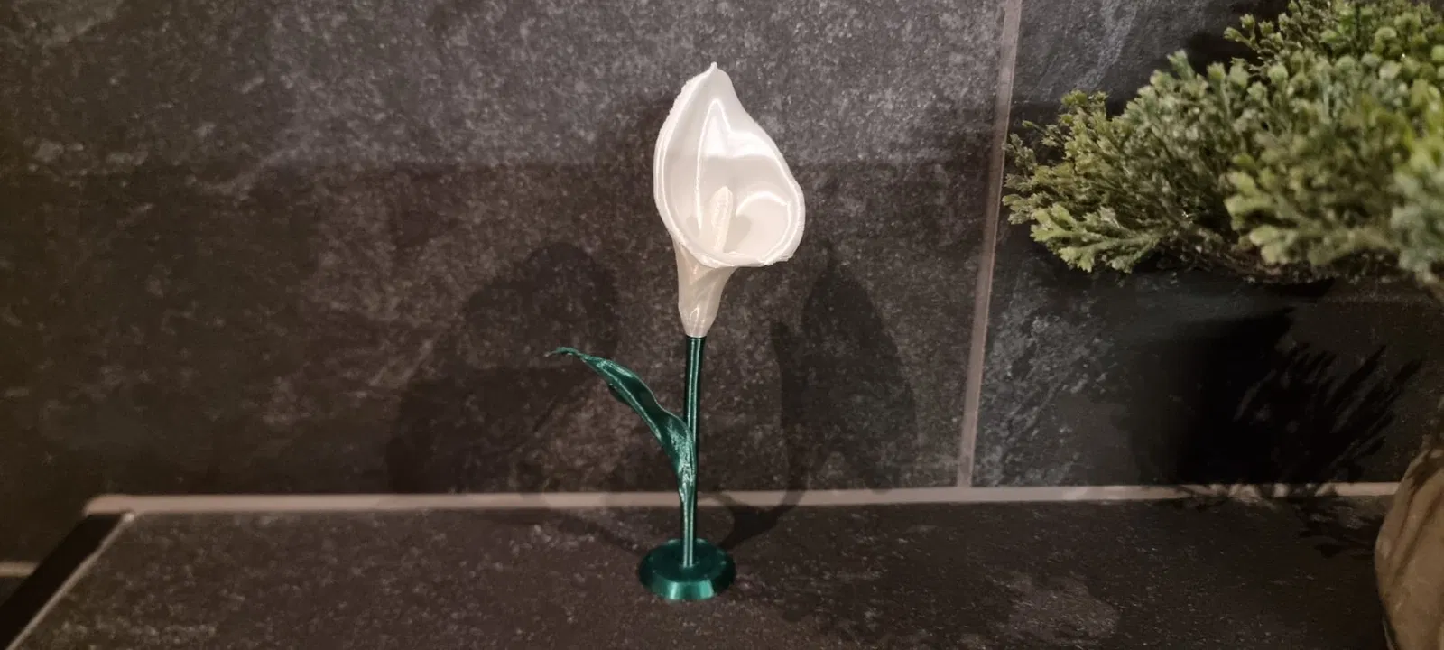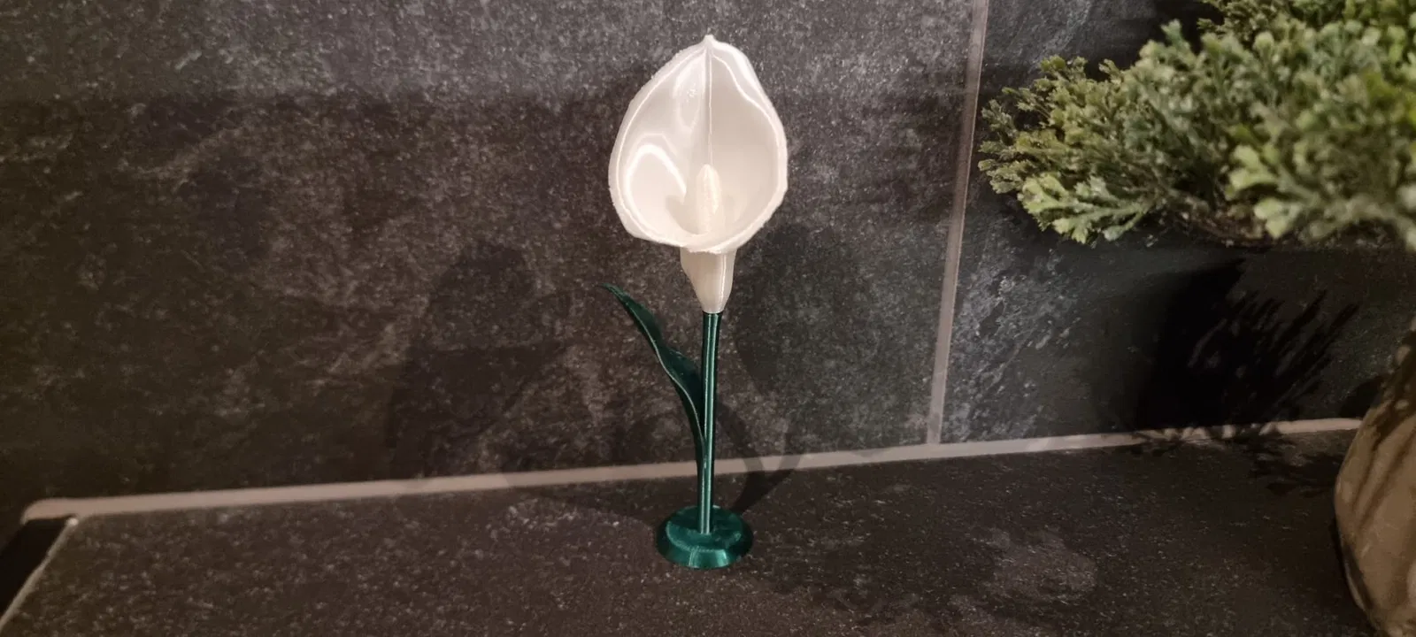 Mẫu Calla Lily chi tiết cao, dáng kèn đặc trưng với bề mặt hiện đại, mịn và bóng nhẹ. In bằng PLA SILK (pearl-white filament), có nhụy (spadix) nổi bật, hợp decor nhà cửa theo phong cách tối giản.