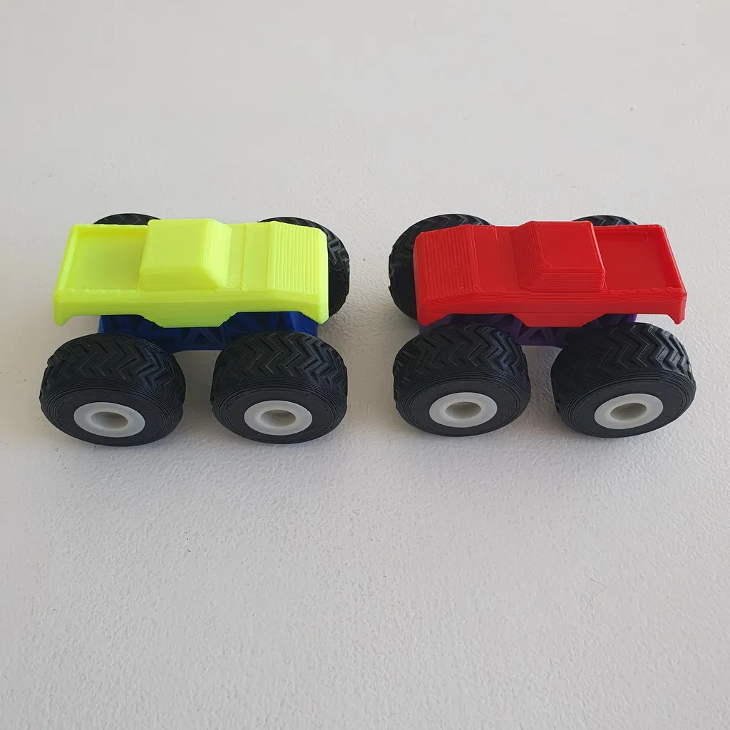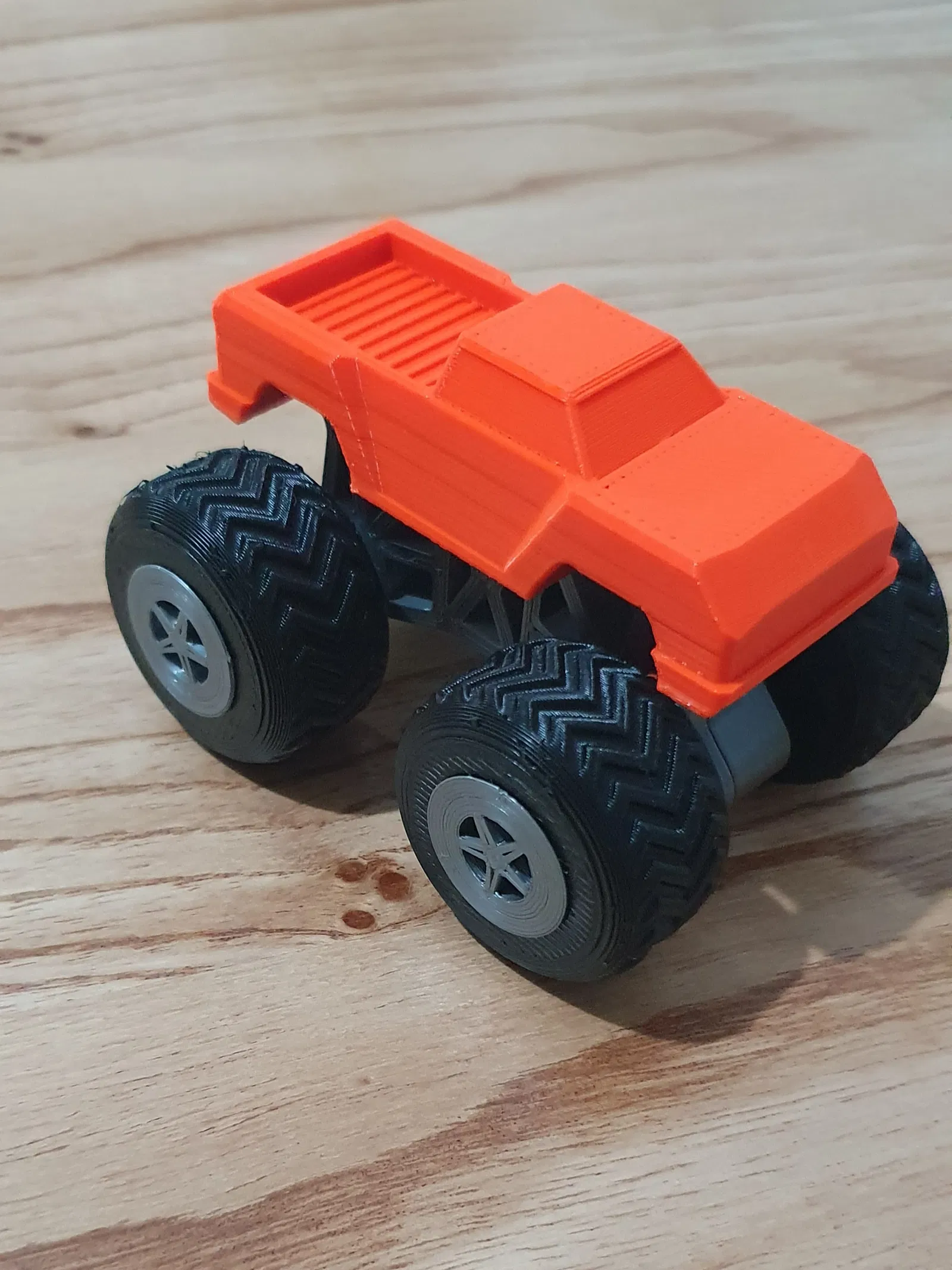 Mẫu Monster Truck Toy V2 được thiết kế theo đúng kích thước xe Hotwheels, chạy vừa 2 đường track HW song song. Bản V2 hoàn toàn không cần supports và lắp ráp không cần keo; có thân, lốp và mâm mới dạng snap-fit.