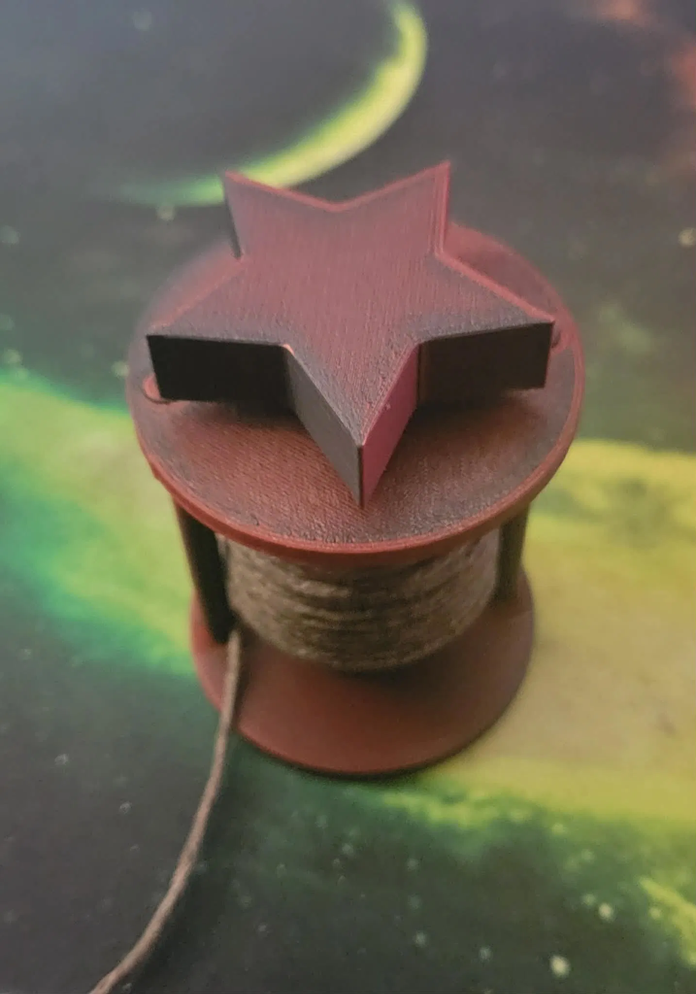Cuộn spool ở giữa có một lỗ xuyên (through-hole) để bạn luồn dây wick qua, giúp bước bắt đầu nạp lại nhẹ nhàng hơn nhiều. Chỉ cần đẩy wick qua lỗ rồi xoay cái núm hình ngôi sao là được! Núm star-shaped ở trên sẽ quay cuộn spool trung tâm. Với lại nếu bạn không dán keo các thanh đỡ (support rods), bạn cũng có thể tháo tấm đáy ra dễ dàng để trượt nguyên một cuộn hemp wick vào trục (spindle).