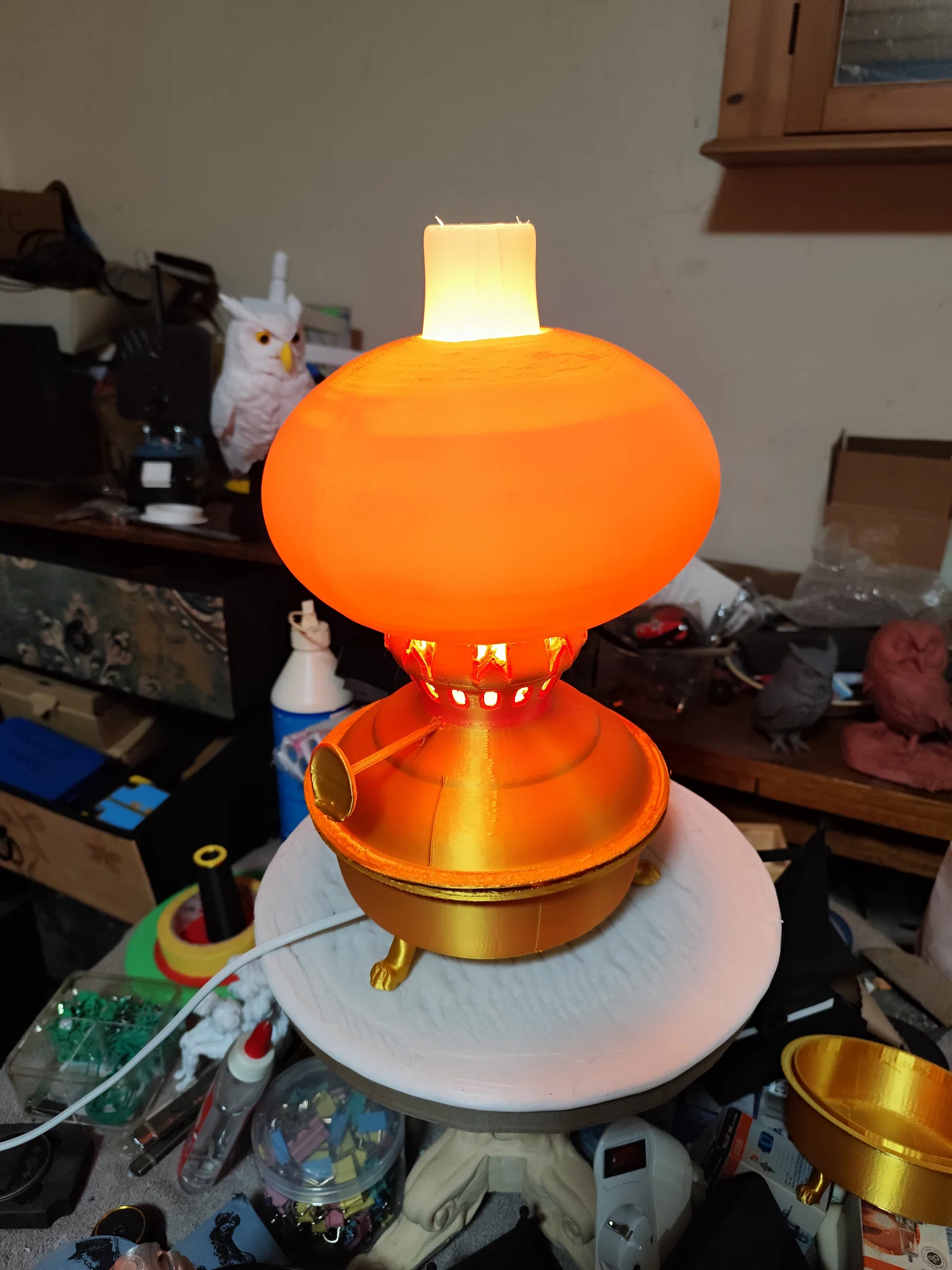 Mô hình đèn dầu cổ gồm burner, chimney và chụp đèn. File có 2 loại chụp: mỏng dễ sập và dày chắc chắn. Gợi ý vật liệu: rainbow, beige, trắng, gold. Lưu ý không dùng bóng đèn nóng vì sẽ làm chảy nhựa.