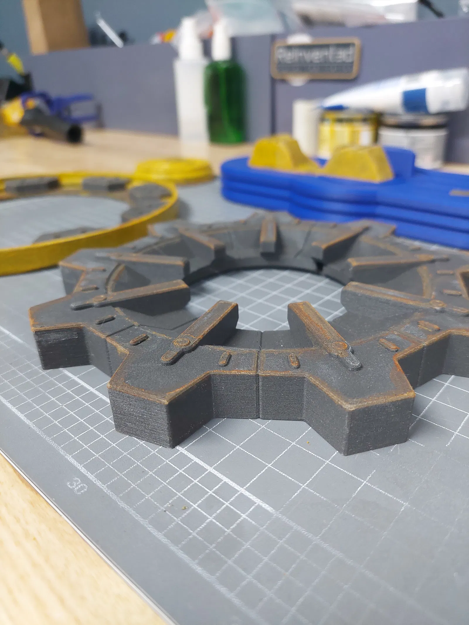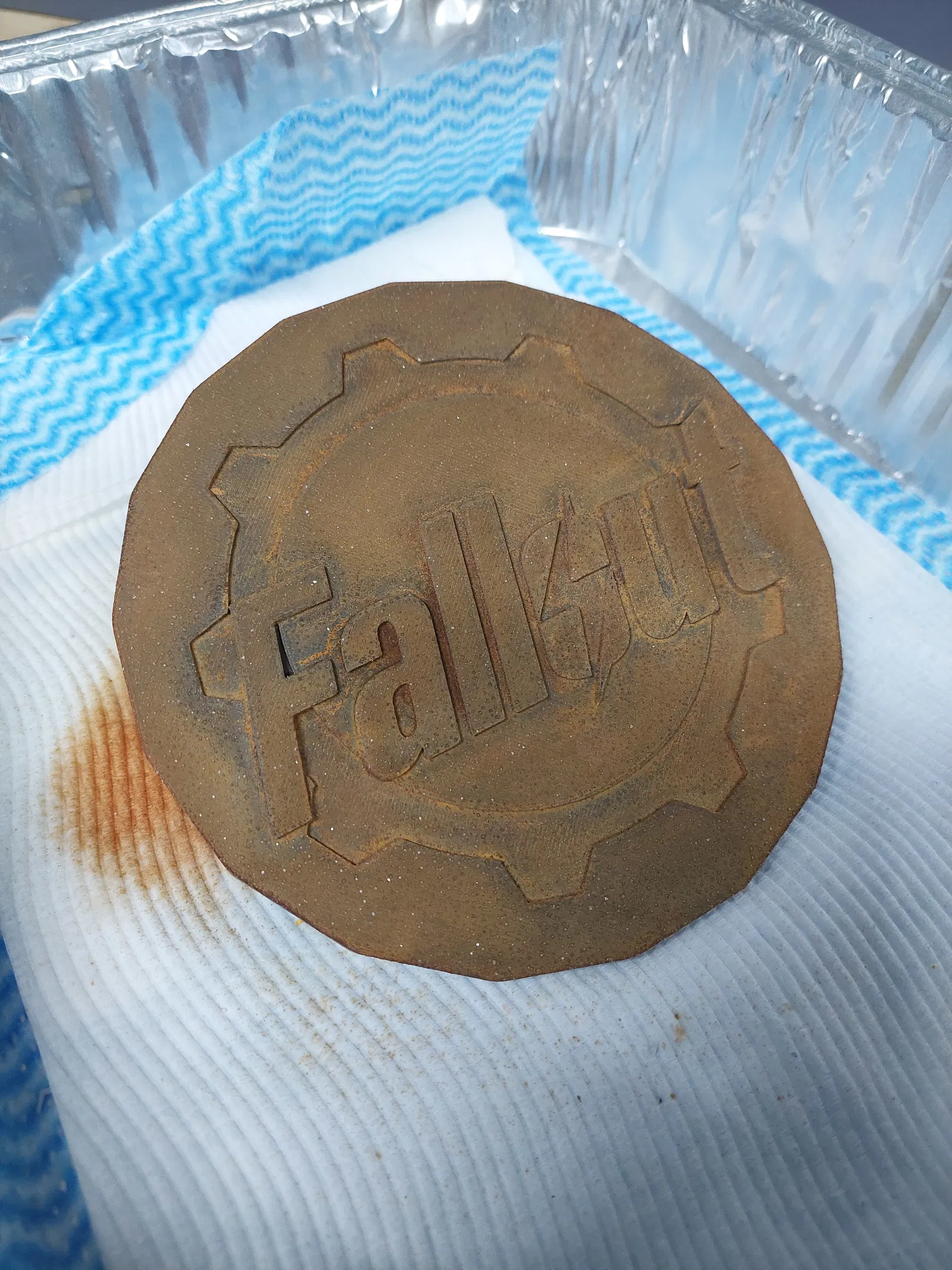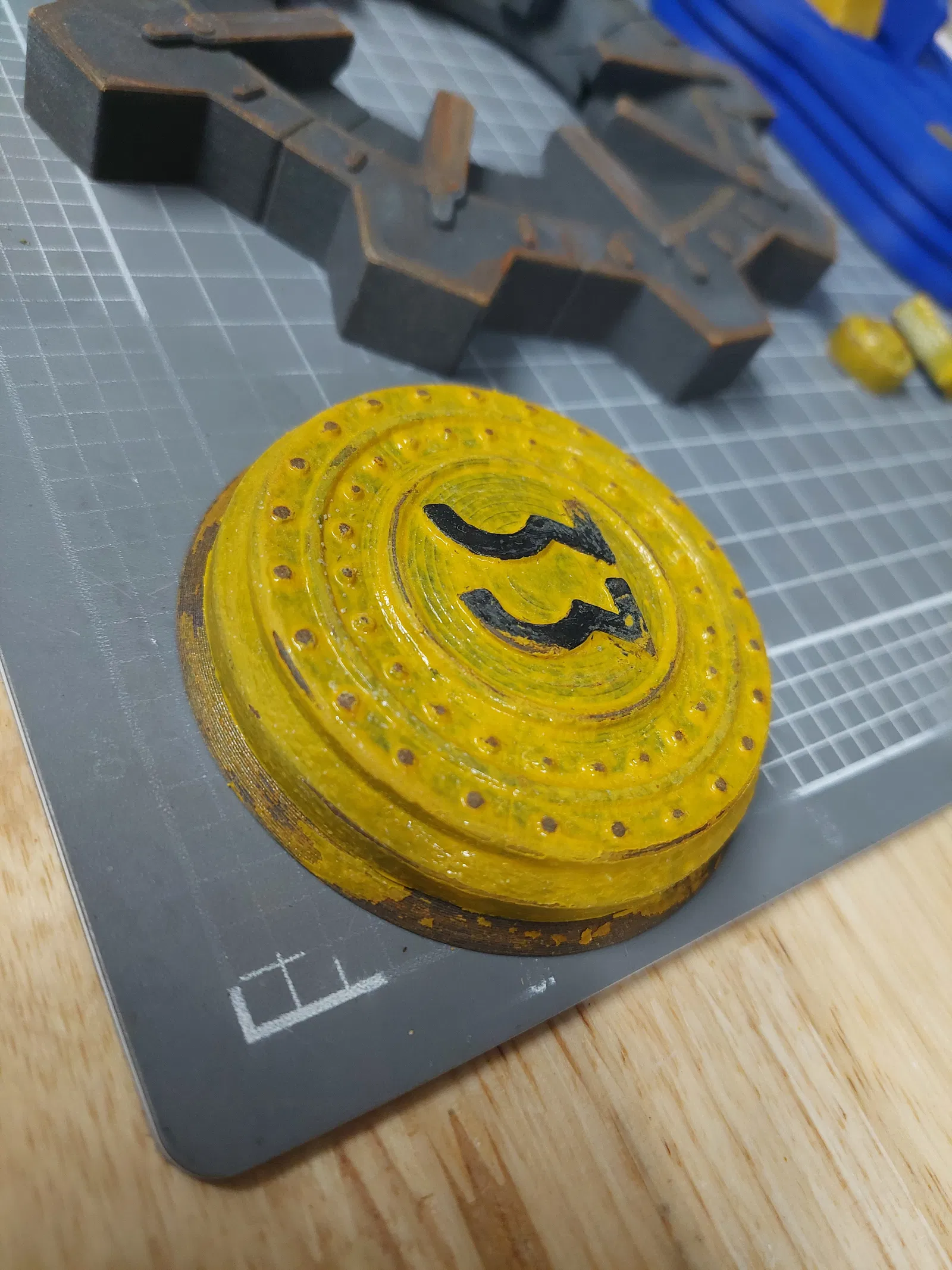 Bản trong hình được in bằng Protopasta iron-fill PLA, xử lý rỉ sét theo đúng hướng dẫn của hãng, rồi sơn bằng acrylic vàng và trắng cơ bản. Làm kiểu cũ cũ (weathered) rất vui, và nhìn “thật” cực kỳ, như đồ bước ra từ trong phim vậy.