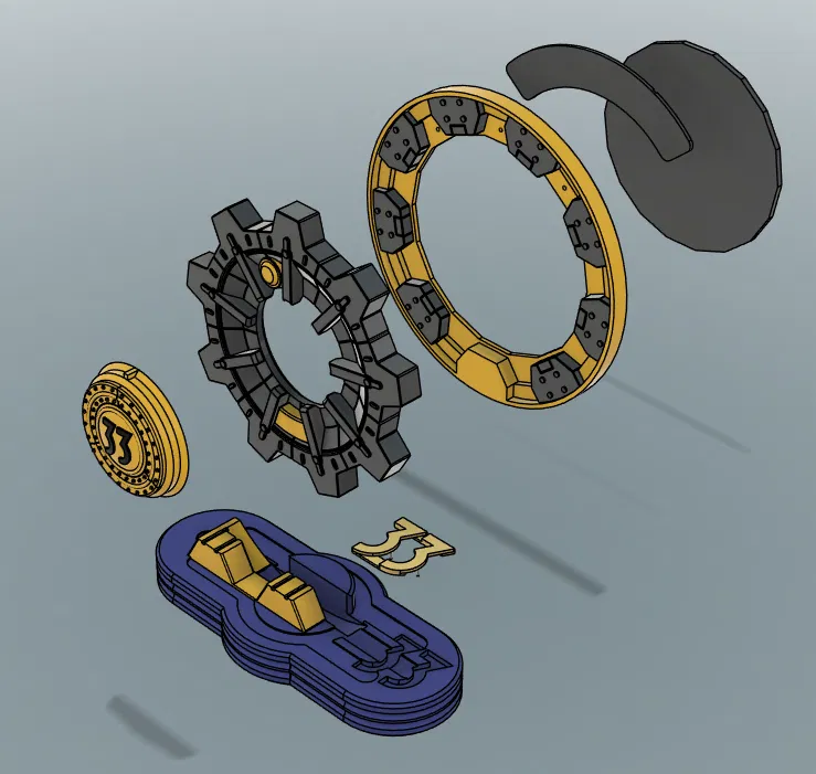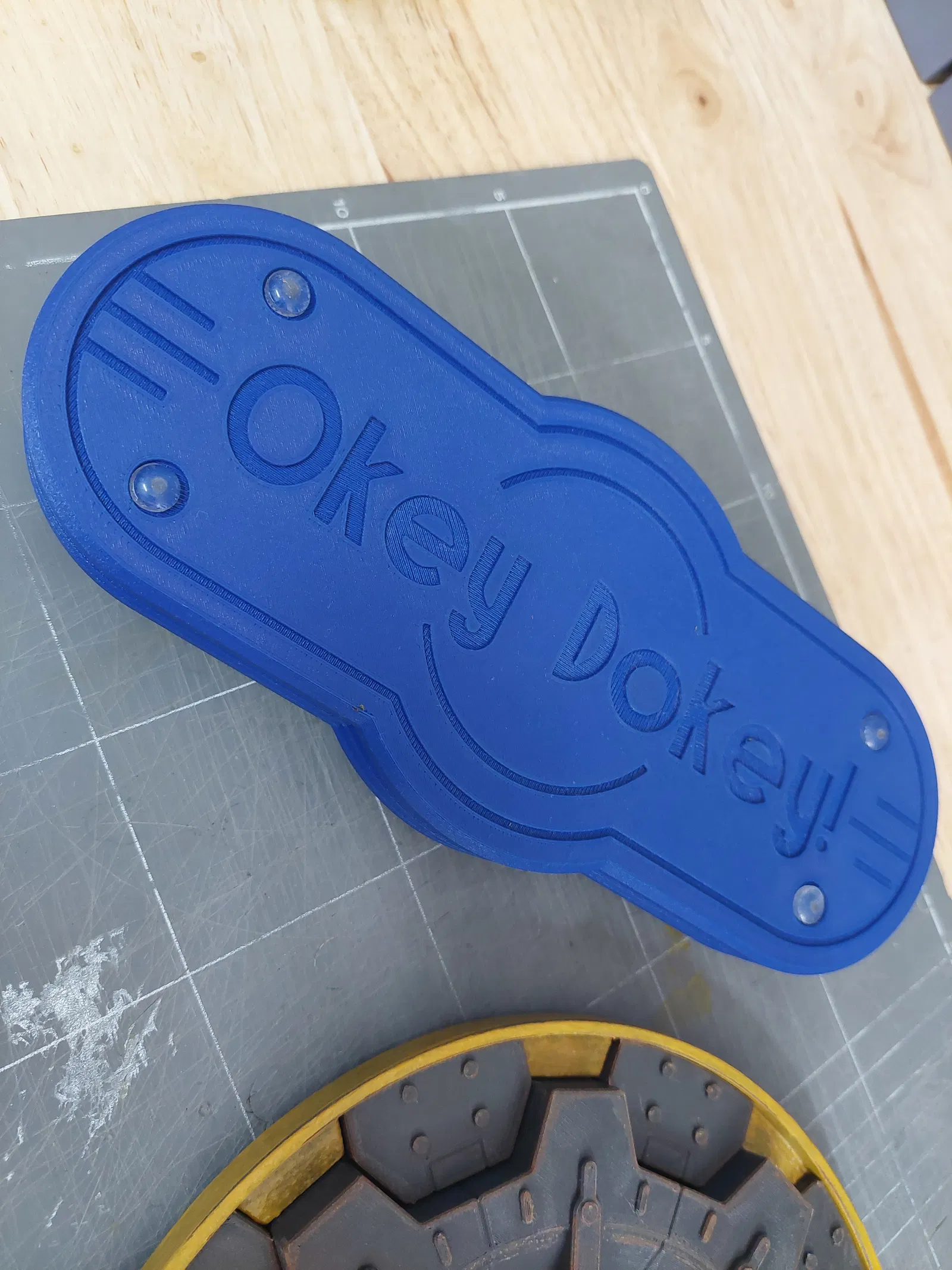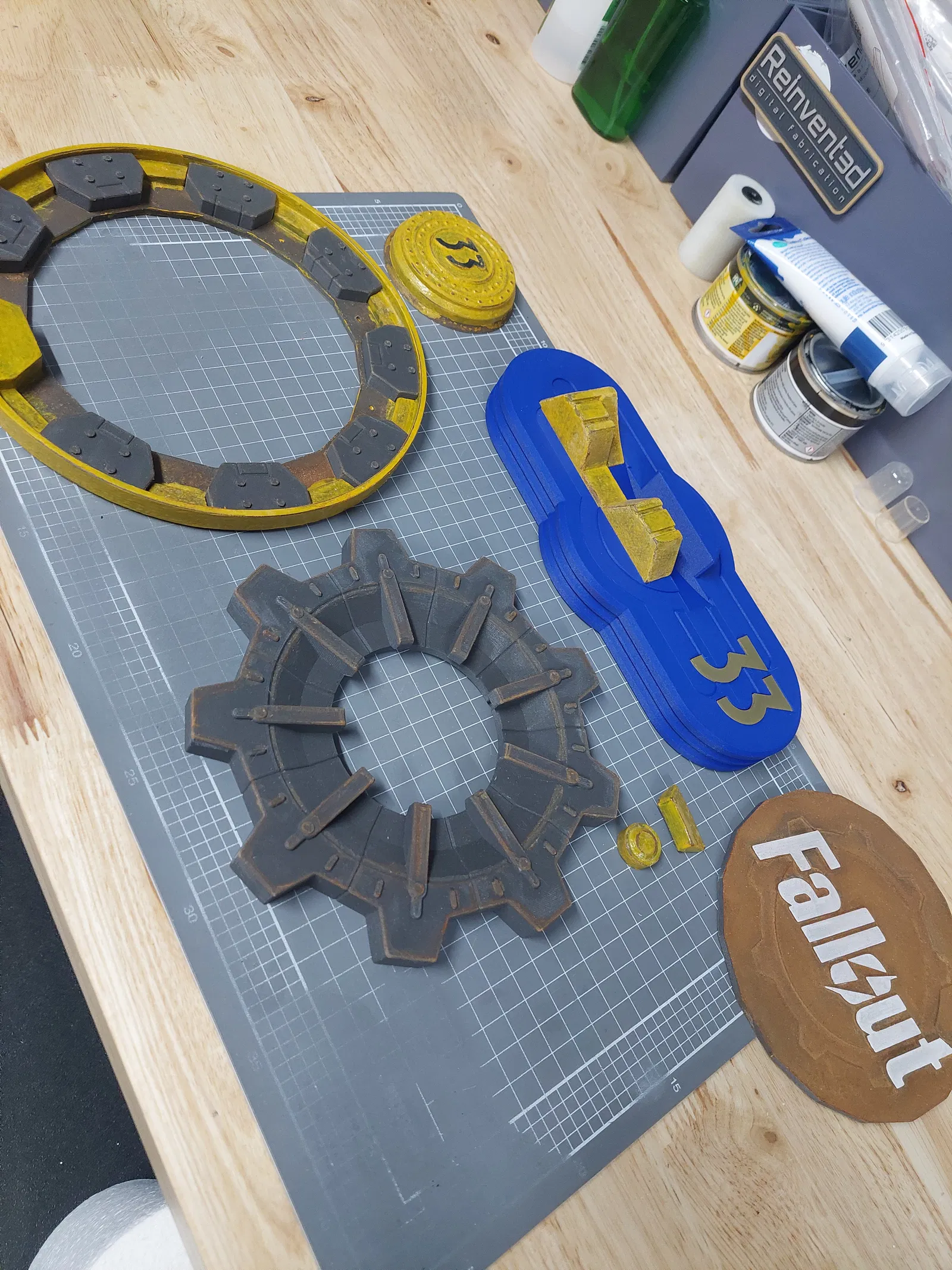 Bản trong hình được in bằng Protopasta iron-fill PLA, xử lý rỉ sét theo đúng hướng dẫn của hãng, rồi sơn bằng acrylic vàng và trắng cơ bản. Làm kiểu cũ cũ (weathered) rất vui, và nhìn “thật” cực kỳ, như đồ bước ra từ trong phim vậy.