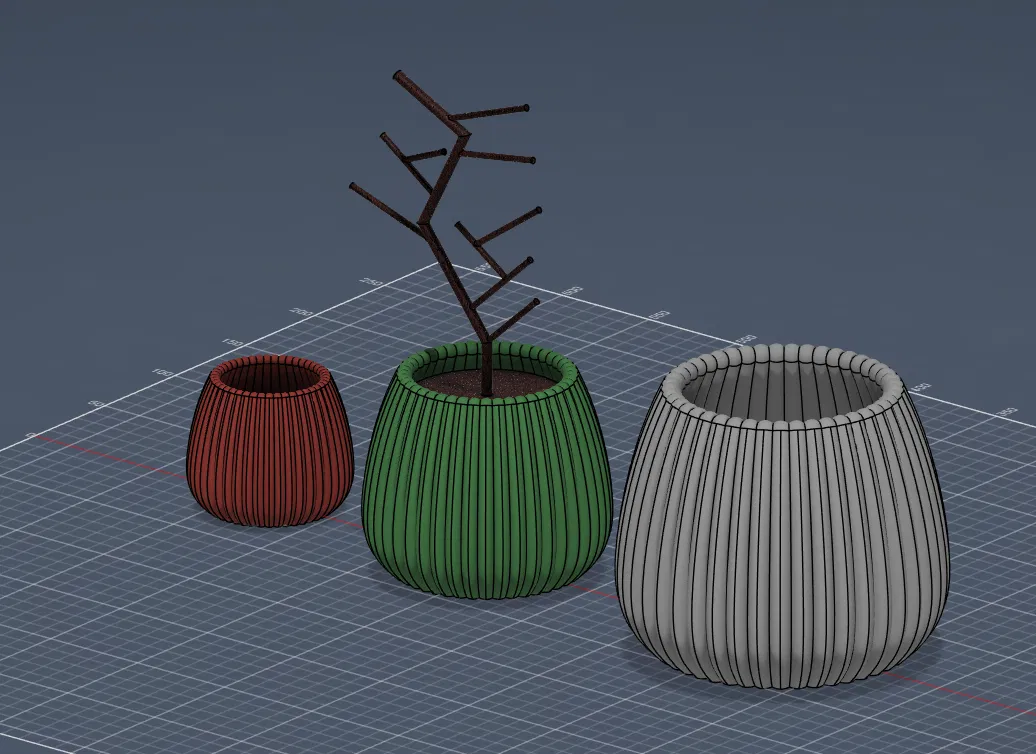 Bộ chậu gân sọc hiện đại gồm cachepot đáy kín và bộ “Pro” 2 món có thoát nước kèm dĩa hứng. In support-free, lên form đẹp; khuyến nghị 3–4 walls, infill 10–15%, dùng PETG/ASA/ABS cho cây thật.