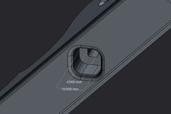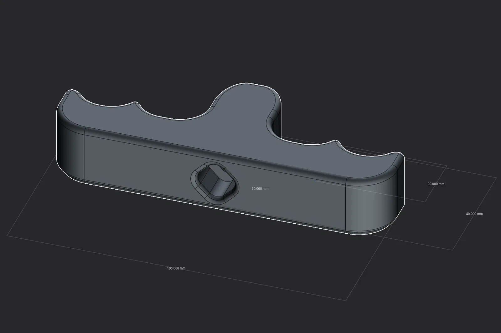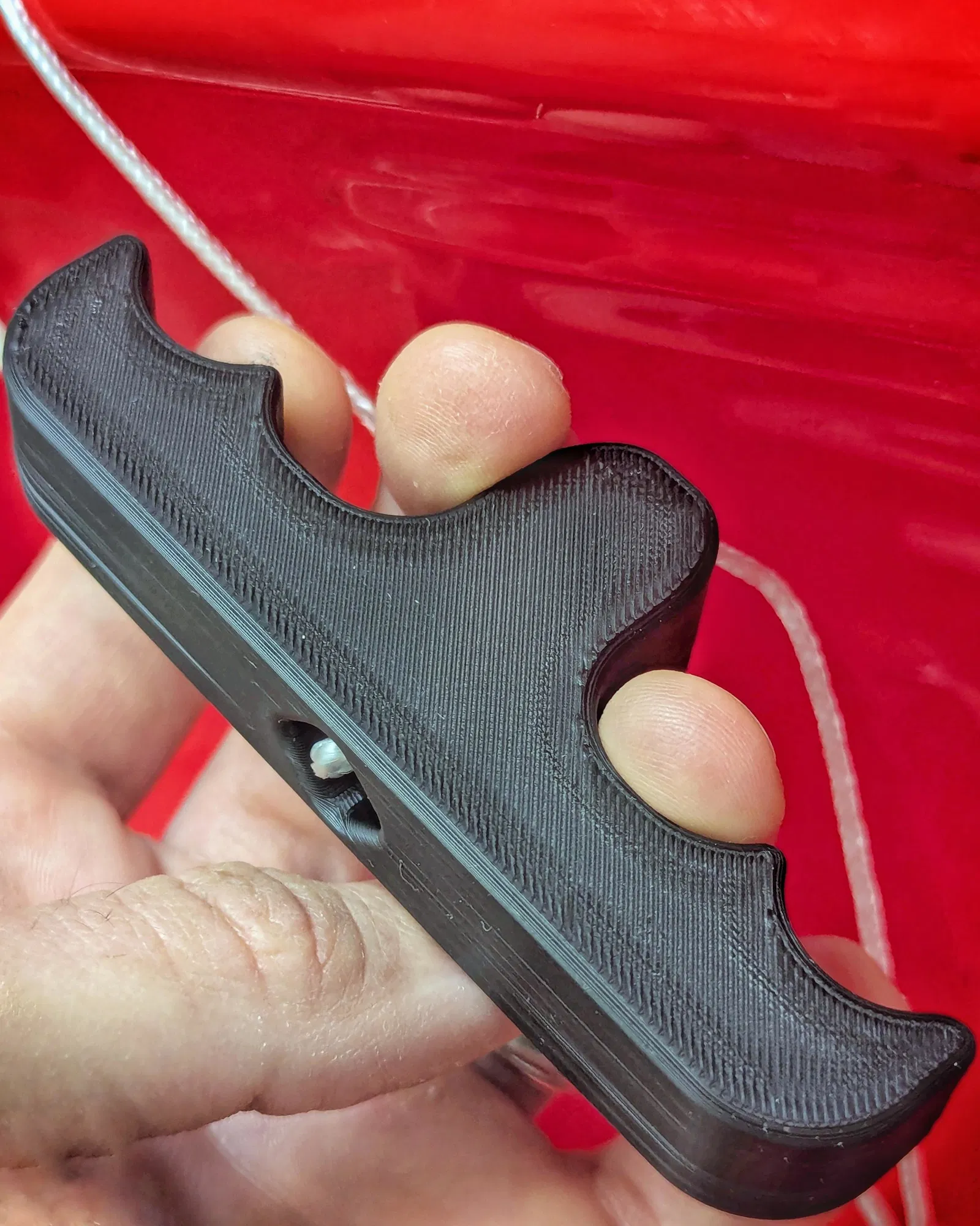 Đây chỉ là một kiểu tay nắm khác. Nó được thiết kế để in khi đặt nằm phẳng, để các đường cong chỗ ngón tay được mịn và hướng layer giúp tăng độ bền. Kích thước: rộng 105mm, dày 20mm, từ tay nắm ra tới đầu là 40mm, và có lỗ vuông 4mm kèm khoảng trống đủ cho một nút thắt 10mm.