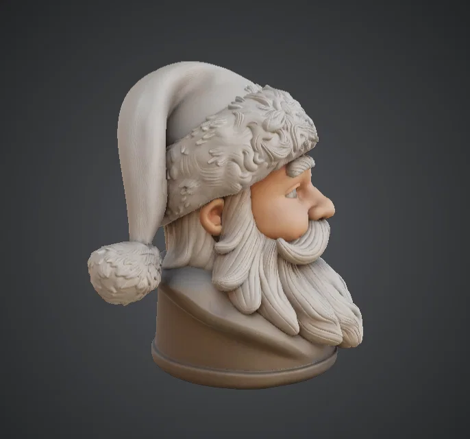 Mẫu sở hữu bề mặt texture tinh xảo từ chiếc mũ viền lông, từng sợi tóc được tạo khối rõ ràng cho tới lớp râu xếp tầng, tạo chiều sâu và độ chân thực ở mọi góc nhìn. Phần đế bán thân bo tròn giúp đứng vững, đồng thời giữ điểm nhấn ở nụ cười vui tươi và các đặc trưng biểu tượng của Ông già Noel.