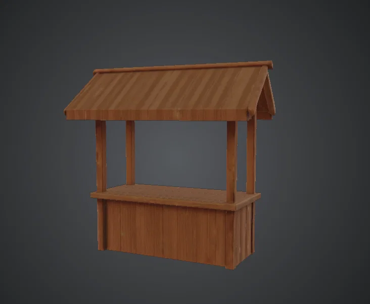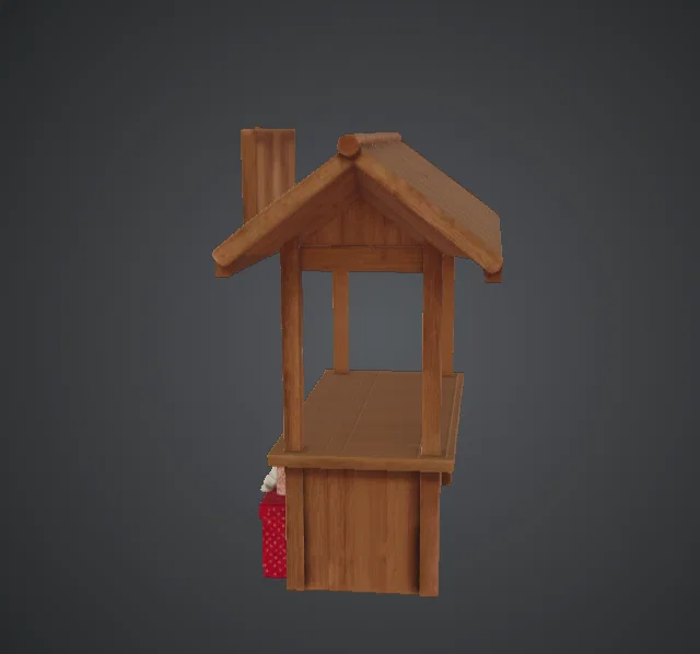 Mẫu Christmas Market Stall phong cách quầy gỗ cổ điển với mái dốc, cột đỡ chắc và vòng nguyệt quế trang trí. Vân gỗ chân thực, mặt trước mở dễ bày biện đạo cụ mini, hợp làm diorama, làng Giáng Sinh hoặc trưng bày theo mùa.