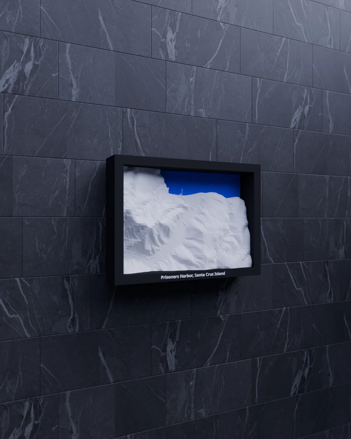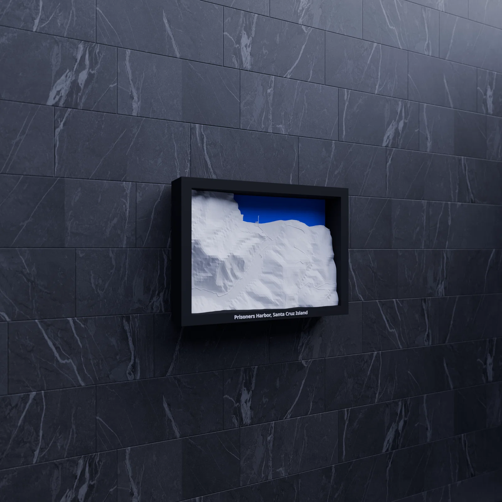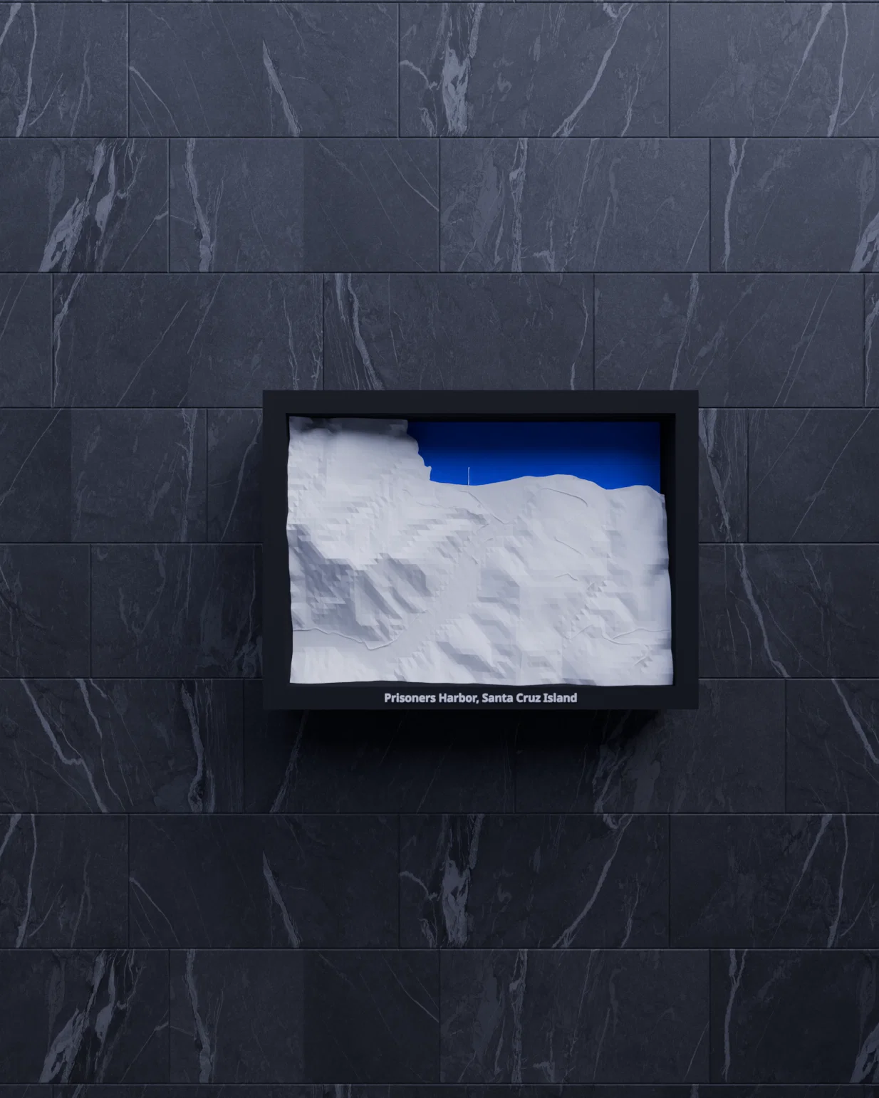 Mô hình địa hình thu nhỏ in 3D tái hiện Prisoners Harbor, Santa Cruz Island (Hoa Kỳ) từ dữ liệu địa lý thực, kèm STL/3MF và nhiều tùy chọn frame có lỗ treo. Phù hợp trưng bày, học tập hoặc làm quà tặng.