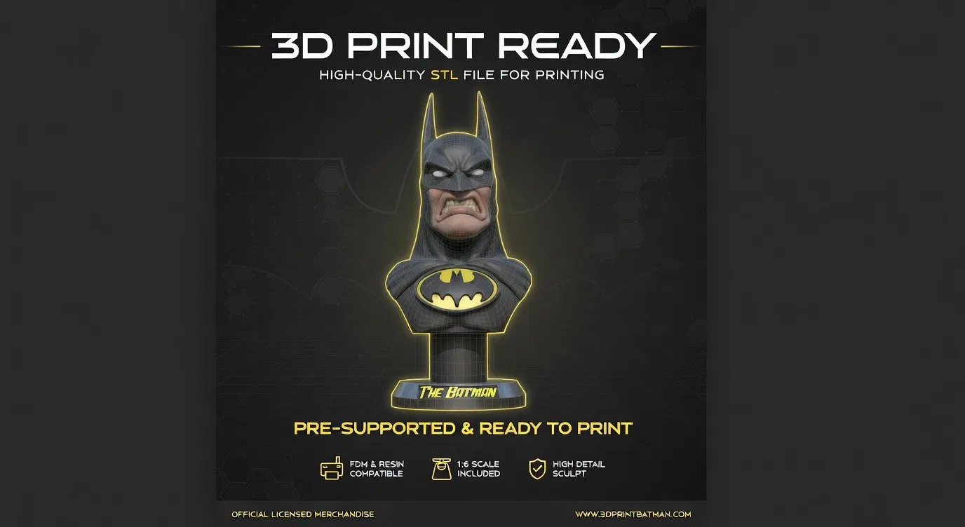 Mẫu 3D “The Batman Head Bust” tái hiện phần đầu của Batman theo phong cách tượng bust, phù hợp trưng bày trên bàn hoặc in mô hình sưu tầm. Nội dung mô tả nguồn gốc Bruce Wayne và biến cố gia đình.