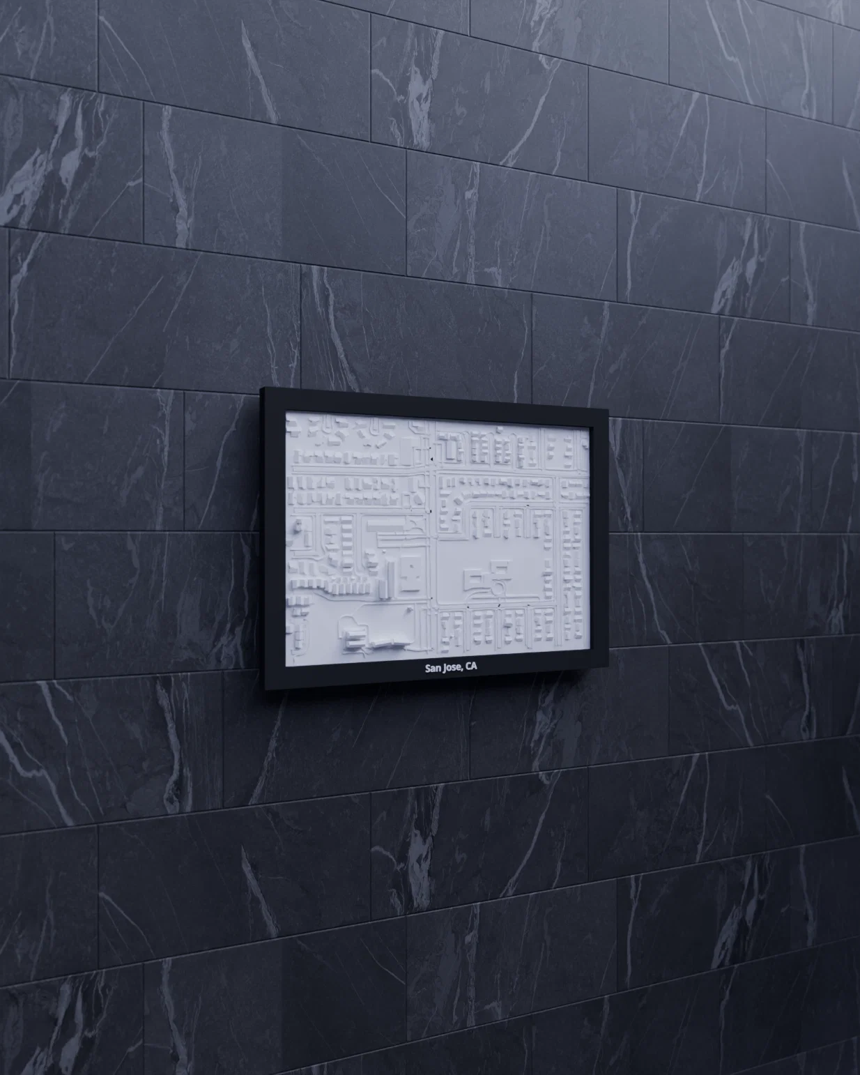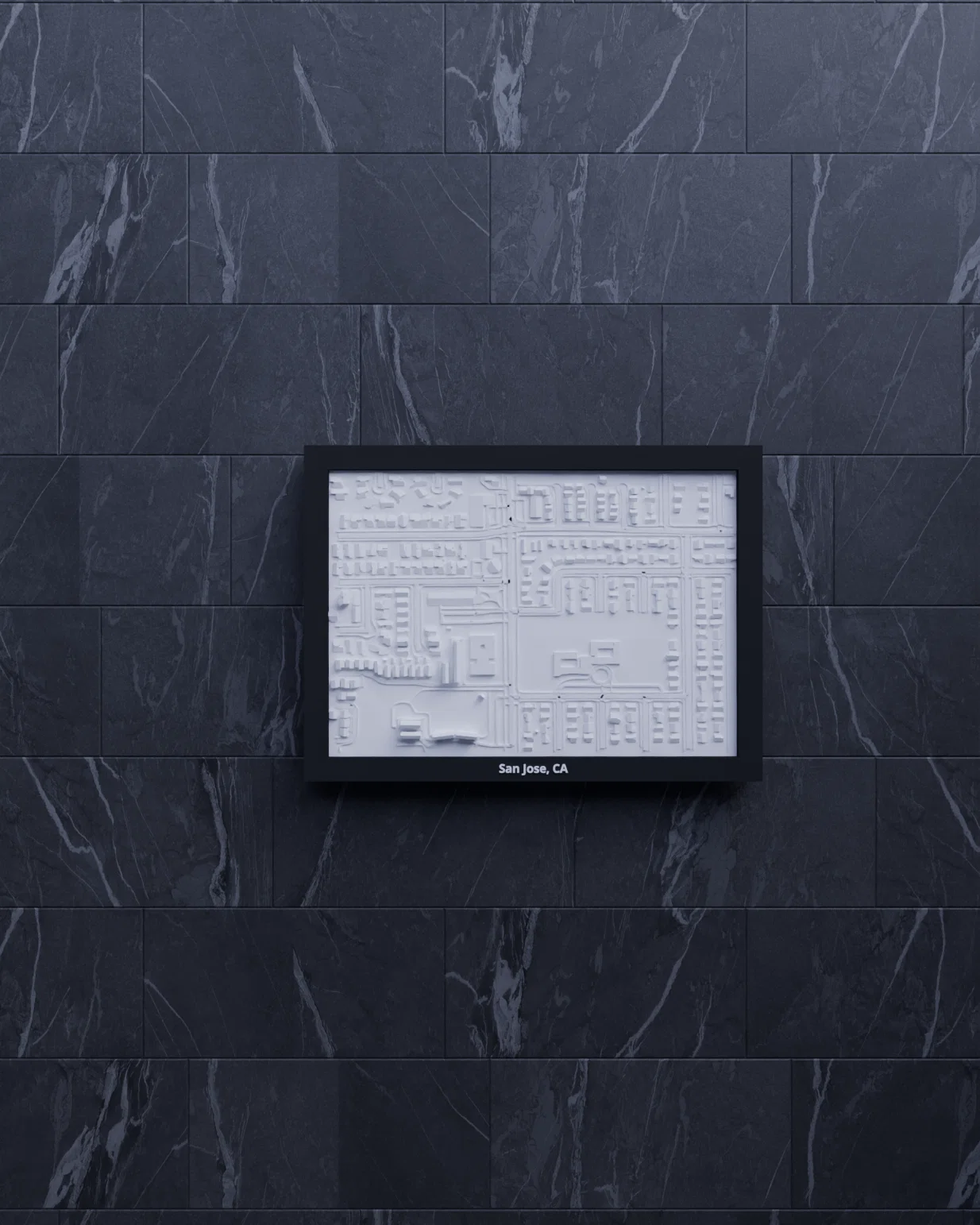 Mô hình thu nhỏ địa hình (topographic) của San Jose, CA dựa trên dữ liệu địa lý thực, thu nhỏ khu vực 0.683 x 0.477 km thành kích thước 170.5 x 119.5 mm (~4005:1). Có STL/3MF và nhiều biến thể khung để trưng bày.