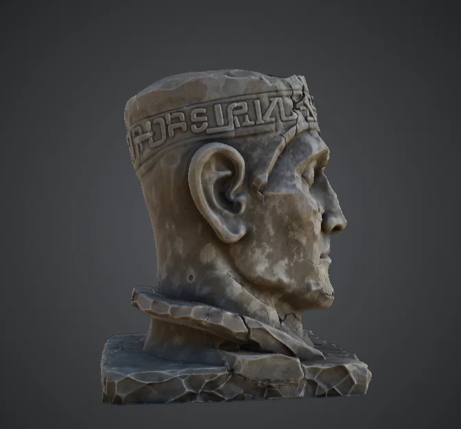 Gương mặt mạnh mẽ, điềm tĩnh với các đường nét đối xứng, nhưng đã bị thời gian làm sứt mẻ một phần, càng tăng cảm giác chân thật của độ “già” theo năm tháng. Những vết nứt sâu và cạnh mẻ tạo cảm giác đã trải qua hàng thế kỷ phơi mưa nắng, rất hợp cho trưng bày mang không khí u tịch và các môi trường nhập vai.