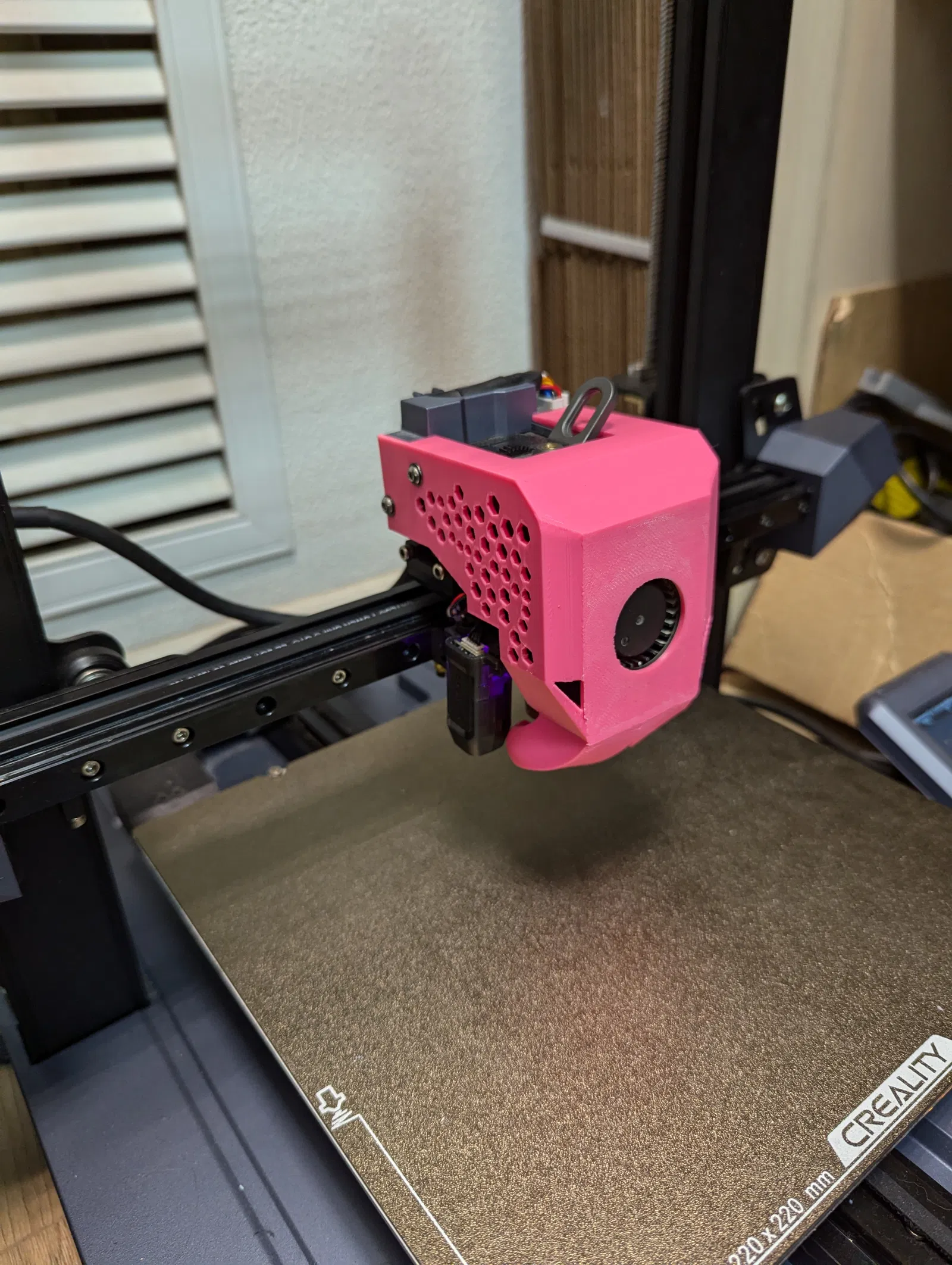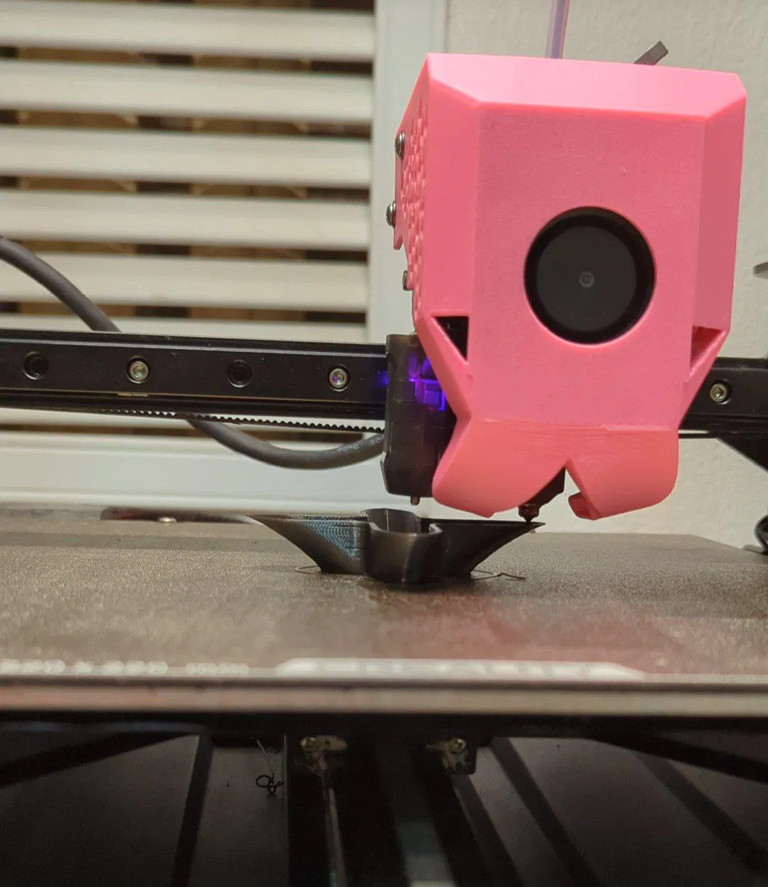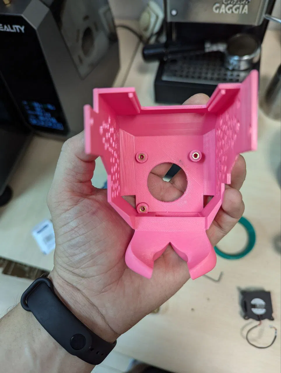 Dùng heat insert M3, quạt stock, ốc stock. Canh cho ống gió cao hơn nozzle một chút và giữ khoảng cách đều. Dùng tree supports ở những vị trí dễ tháo. Layer height 0.14–0.16.