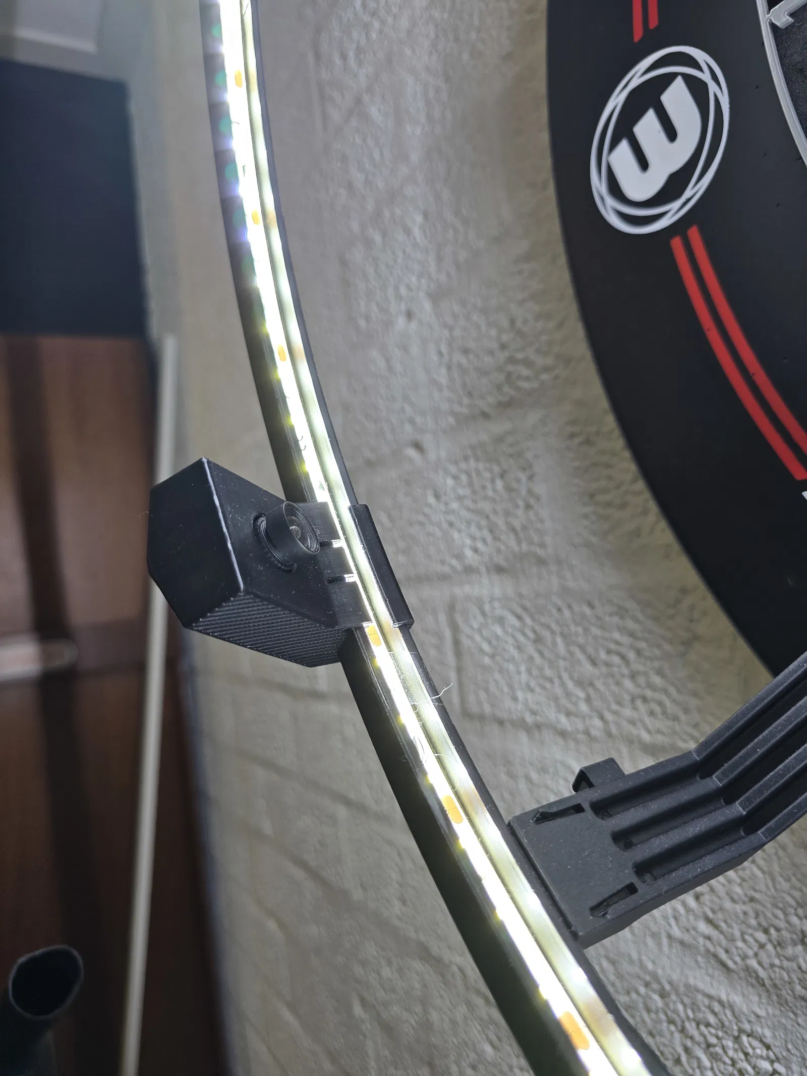 Bracket gắn camera OV9732 dạng kẹp, thiết kế để clip trực tiếp lên Target Corona Vision Light Ring, giữ chắc PCB/lens cho hệ thống chấm điểm phi tiêu bằng computer vision (AutoDarts/DartScoreCounter) mà không làm hư vòng đèn.