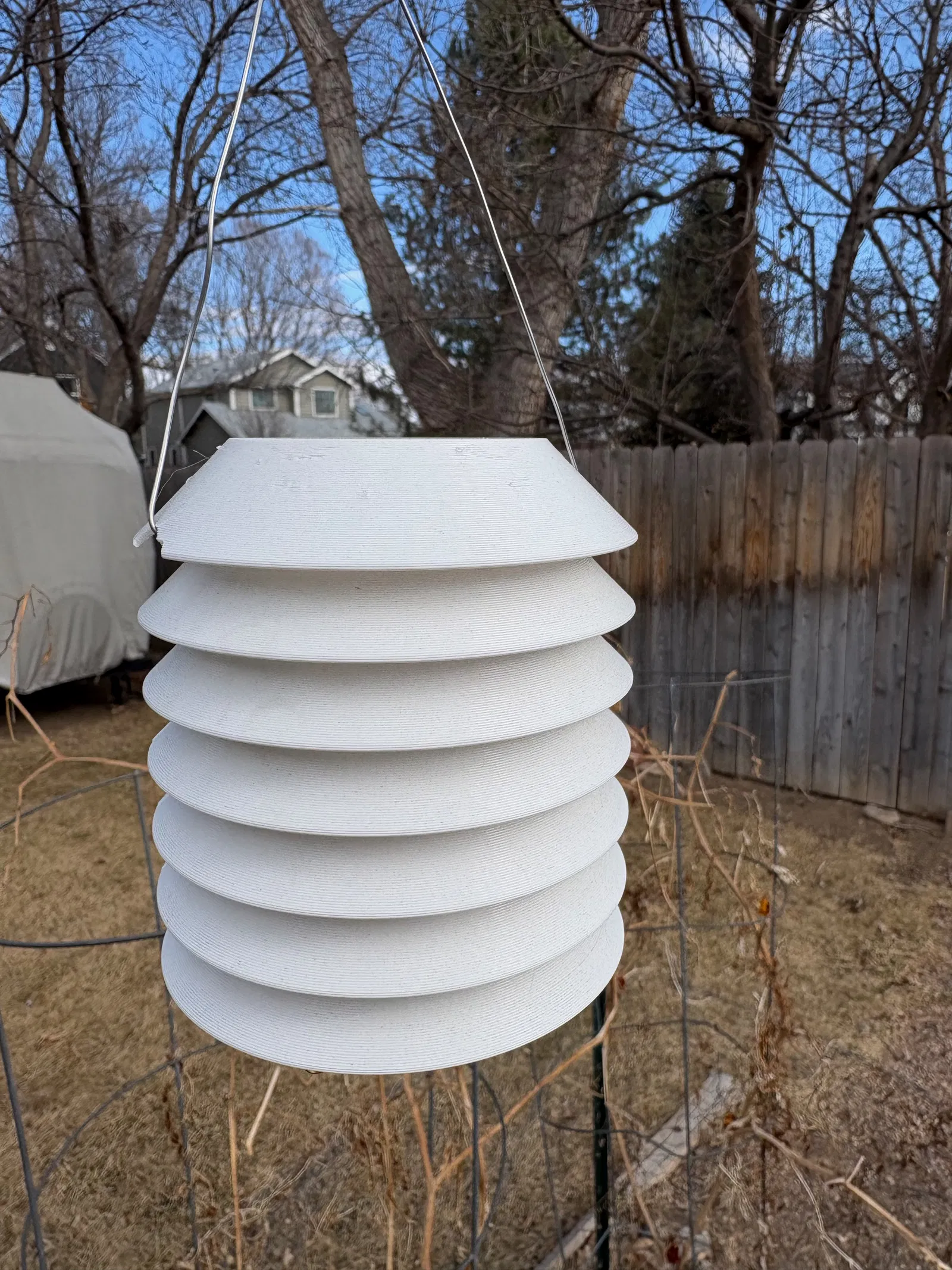 Mẫu tấm chắn bức xạ (radiation shield) dành cho cảm biến nhiệt độ của trạm thời tiết, giúp giảm ảnh hưởng ánh nắng trực tiếp lên kết quả đo. Tương thích với BIUWING và có thể hợp với vài hãng khác.