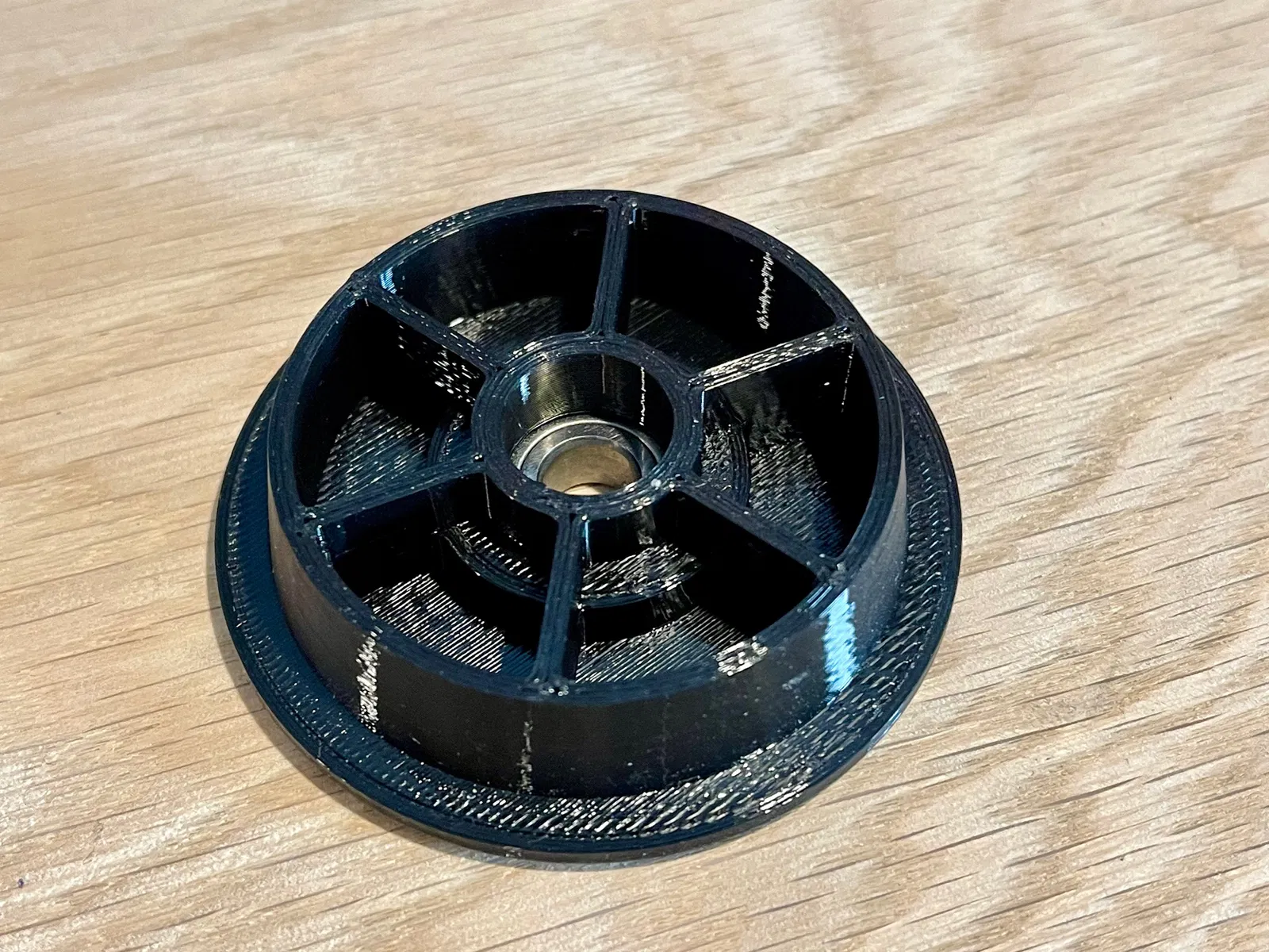 spoolhub đã in, ép bearing vào (mặt bearing hướng về phía ê-cu ở trên)