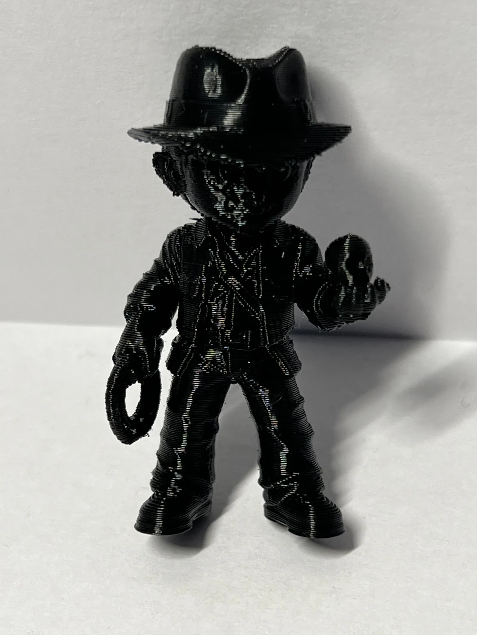 Mô hình tượng 3D Chibi Indiana Jones do AI tạo ra, phù hợp in kích thước nhỏ để trưng bày. Ảnh chỉ mang tính minh hoạ; mẫu được thiết kế để in ổn, dù chụp macro có thể thấy vài khuyết điểm nhỏ.