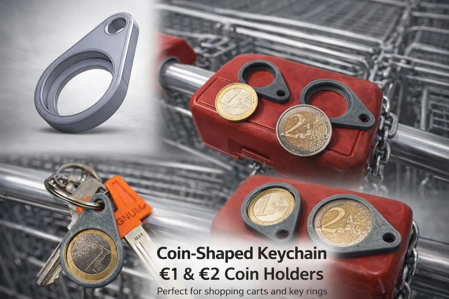Móc khóa giữ đồng xu in TPU, thiết kế gọn đẹp, không cần supports và tiết kiệm vật liệu. Dẻo, dễ gắn/lấy đồng nhưng vẫn ôm xu rất chắc. Có thể scale ngay trong slicer (XY). Hỗ trợ xu 1€ và 2€.