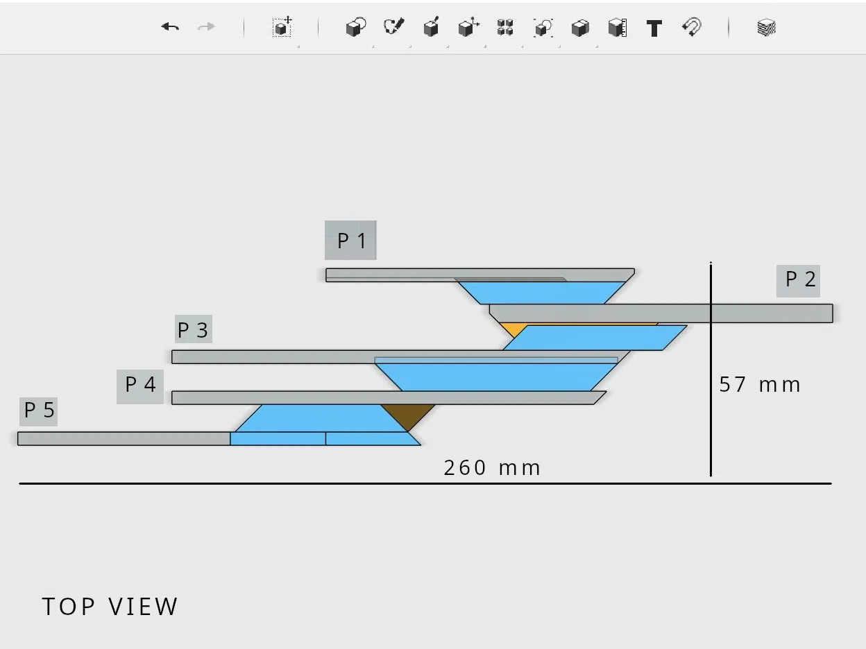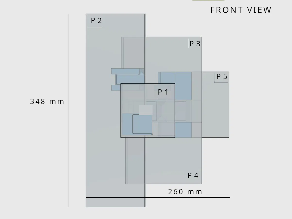 - Panel lớn nhất, P2, được in theo đường chéo trên bàn in 256 x 256 mm (kiểu Bambu Lab A1).