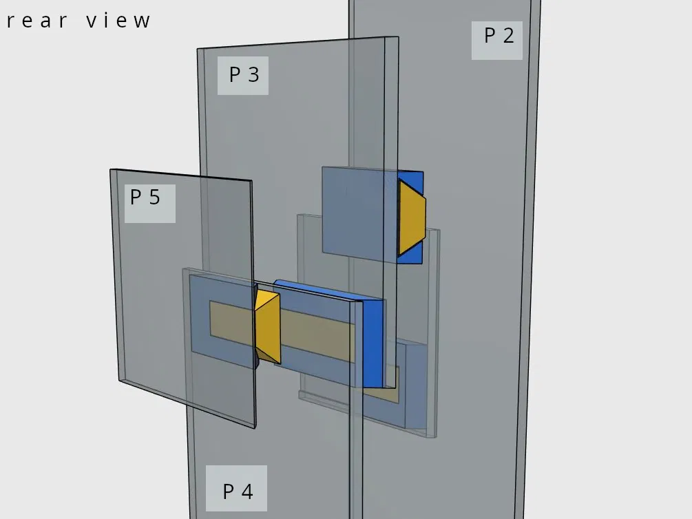 De plus en permettant d'imprimer tous les panneaux en « mode vase », le gain de temps d’impression serait considérable. Donc, j'ai dessiné un système de glissières solidaires de chaque panneau, qui permet une impression en « mode vase » du panneau et du « système de fixation solidaire » (voir principe photo).