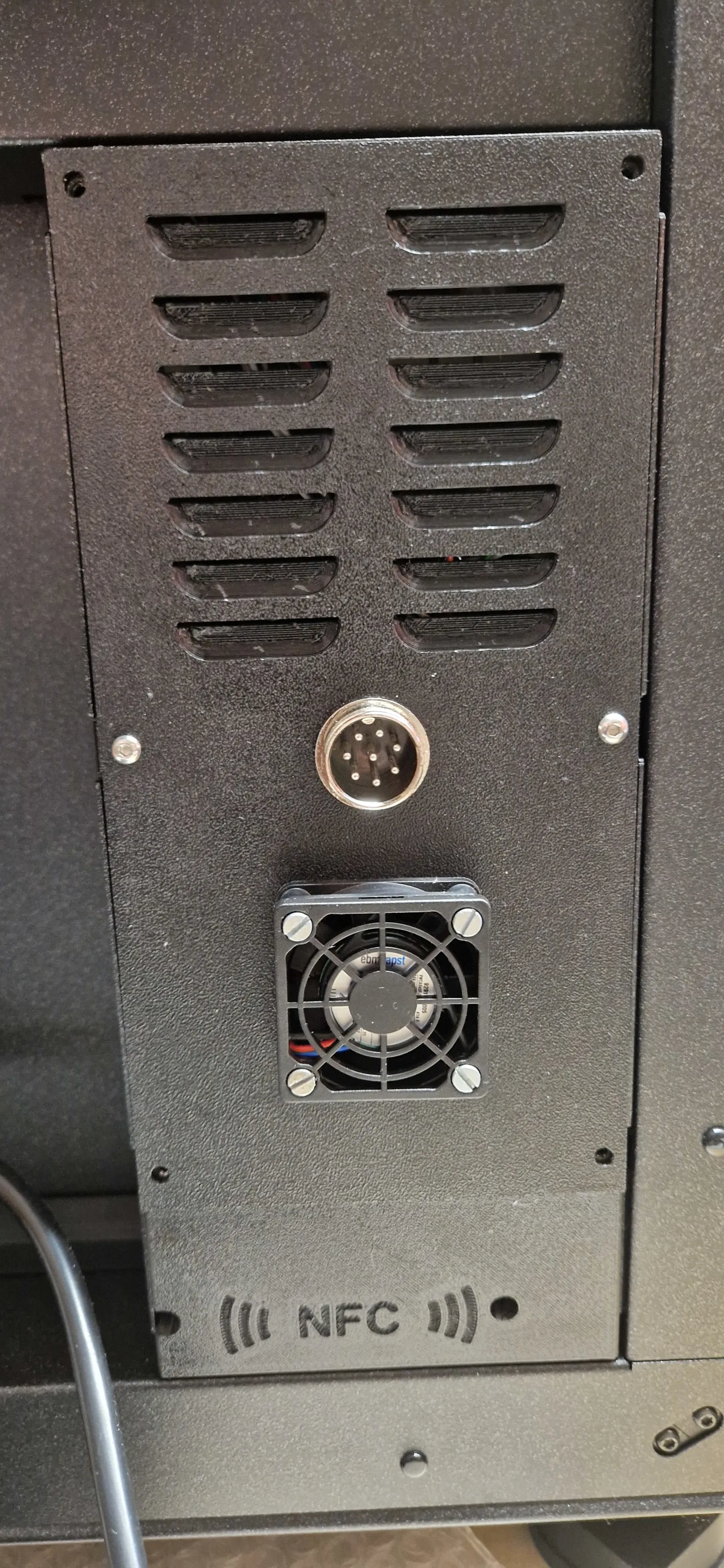 Nắp che cho hộp điện tử Prusa Core One, thiết kế để gắn ổ cắm GX20 8-pin tạo kết nối tới MMU3. Dùng quạt axial PAPST 414 F 40x40x10mm 24V kèm lưới lọc bụi DELOCK 67309; linh kiện dễ tìm mua.