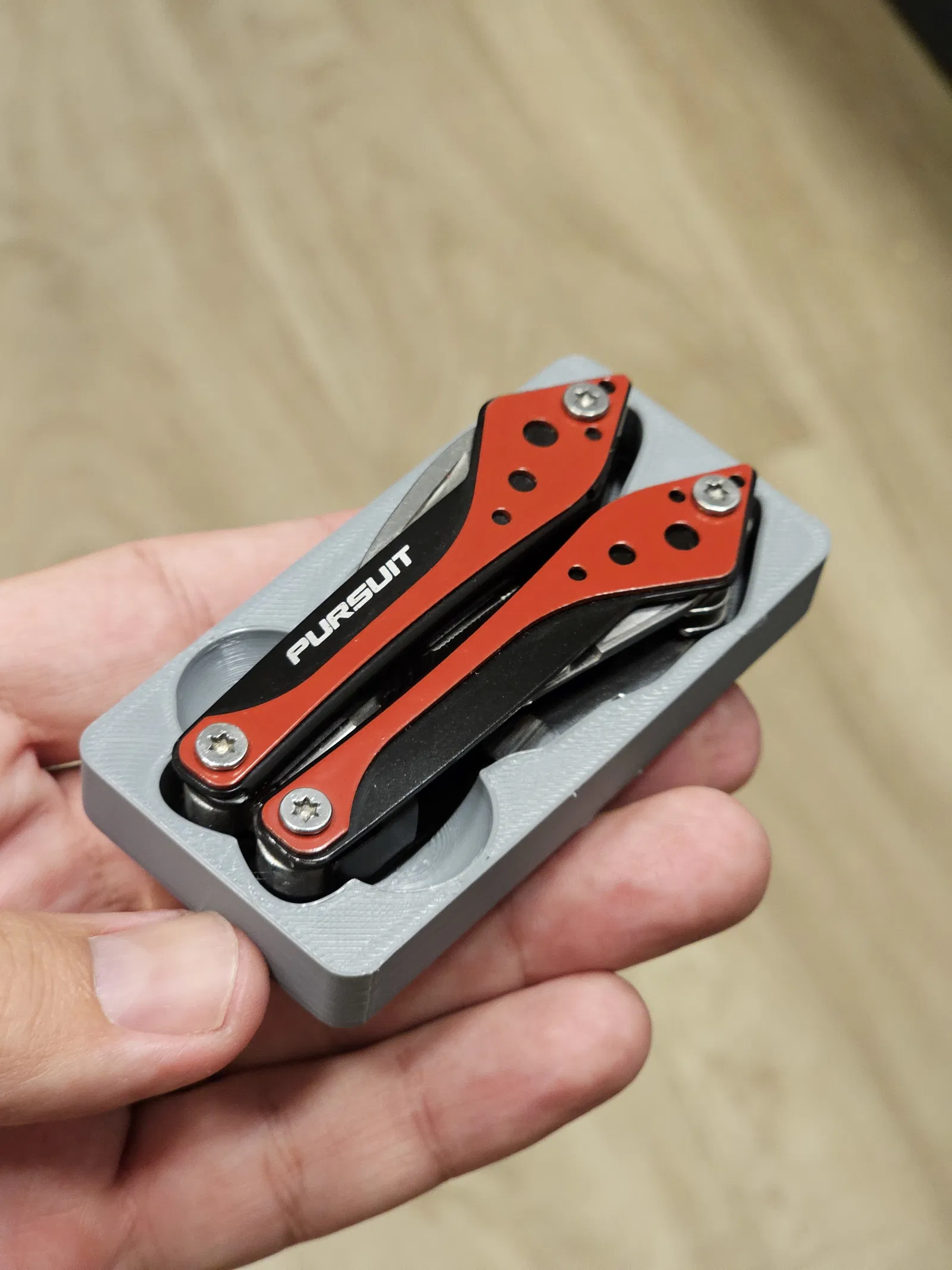 Khay Gridfinity 2x1 thiết kế riêng cho multitool Pursuit, ôm vừa khít không viền. Tác giả in PETG với layer 0.2mm; nếu in layer 0.4mm có thể sẽ chặt hơn. Hợp làm quà tặng.