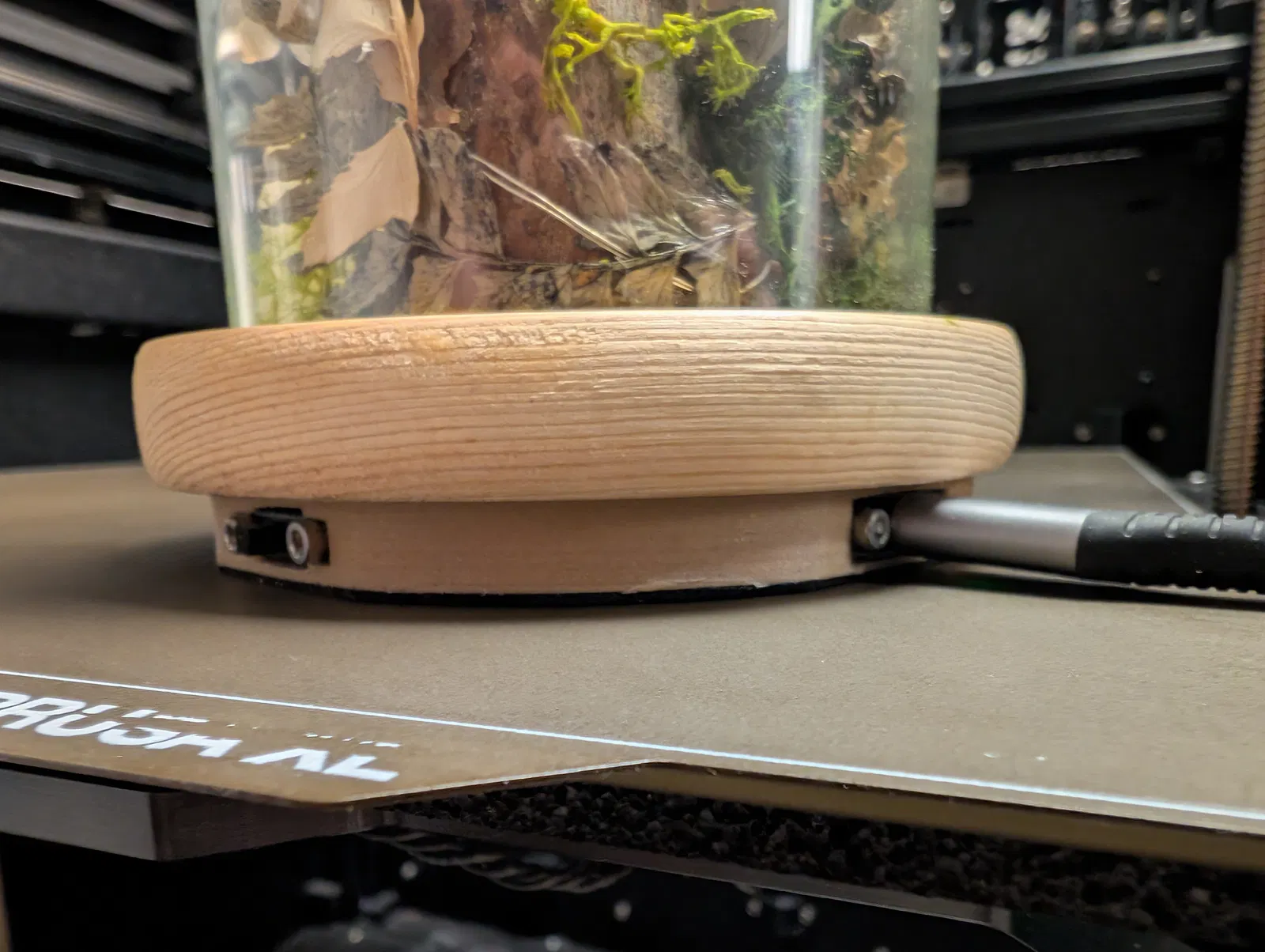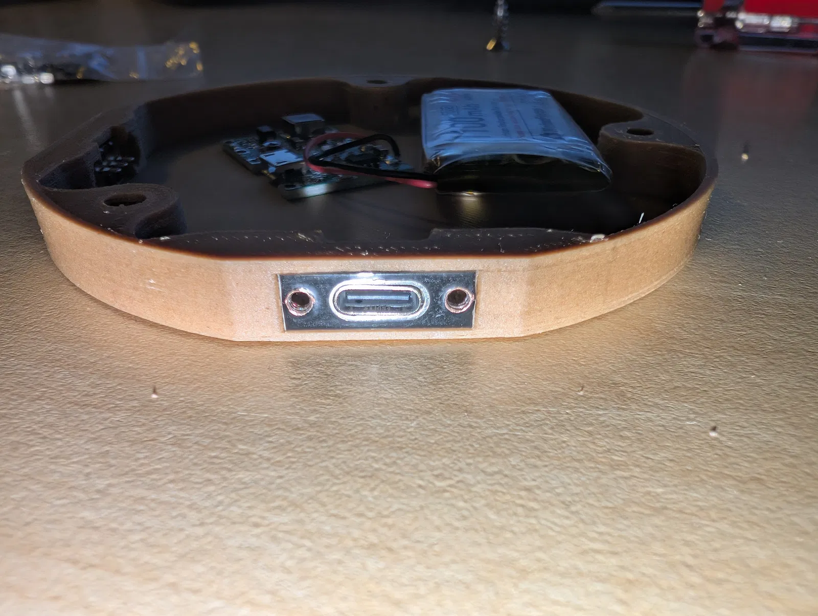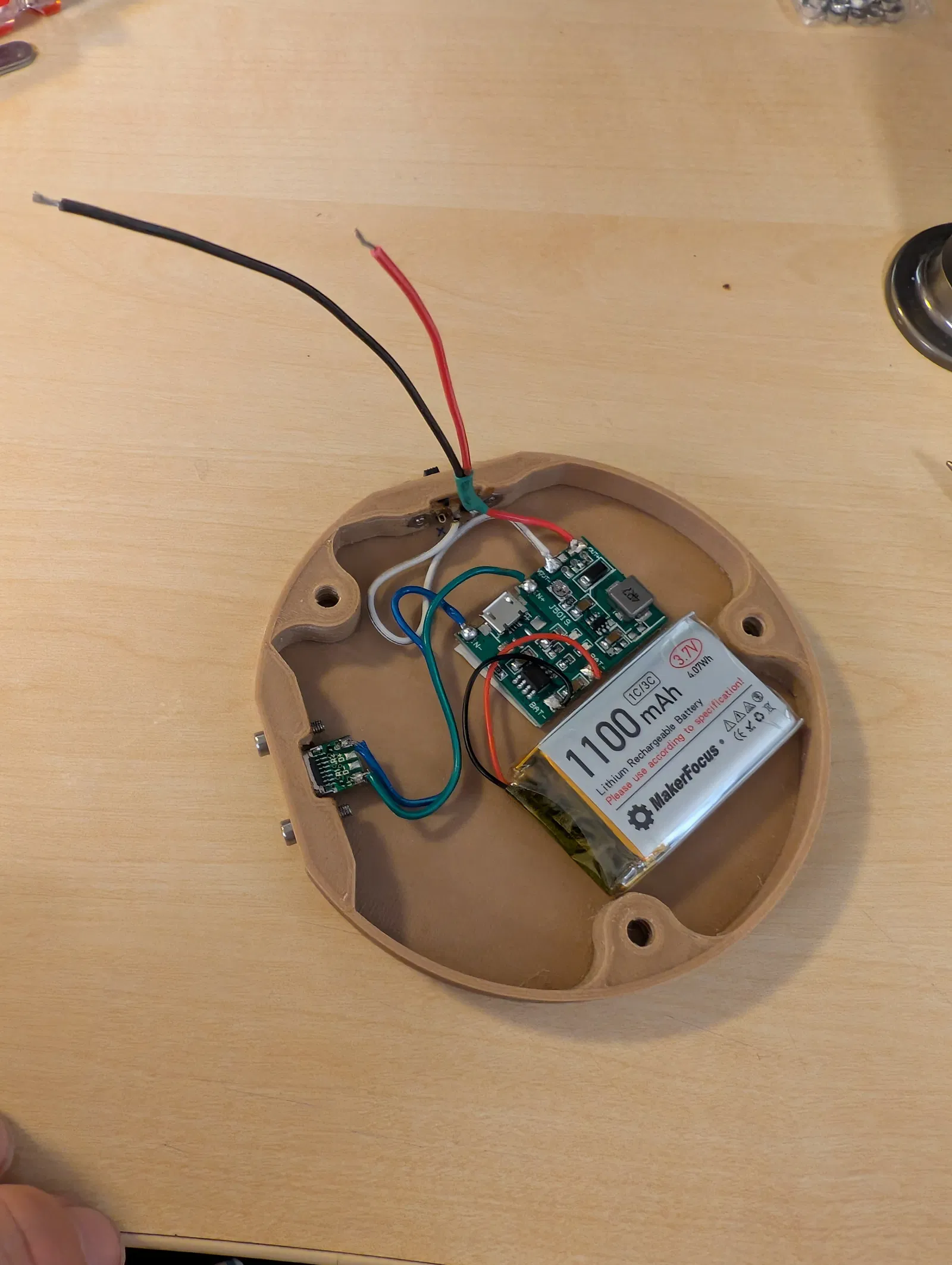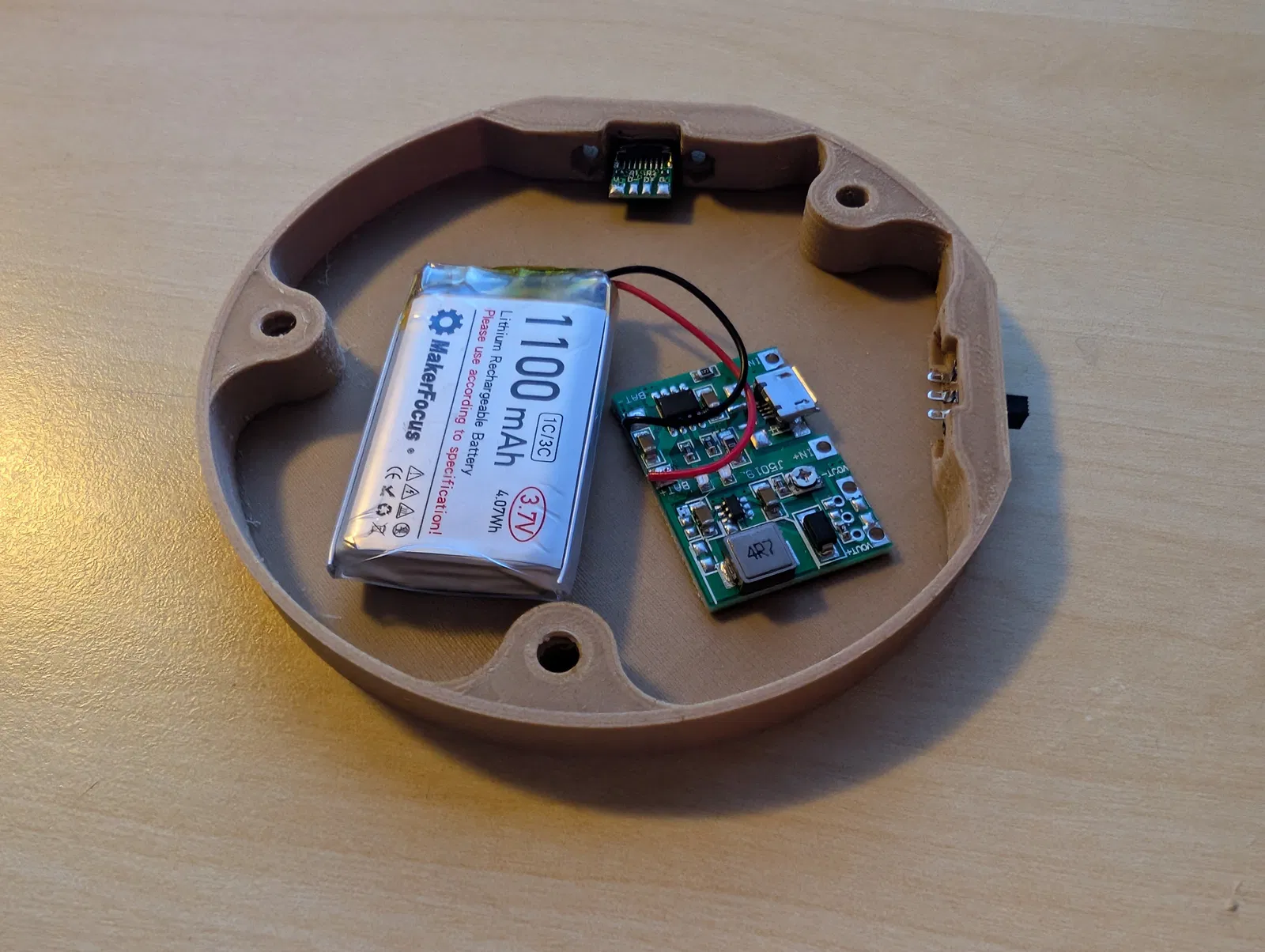 Đây là một cái đế cho diorama tròn (⌀ 10 cm) có công tắc, cổng USB-C, pin và mạch sạc.