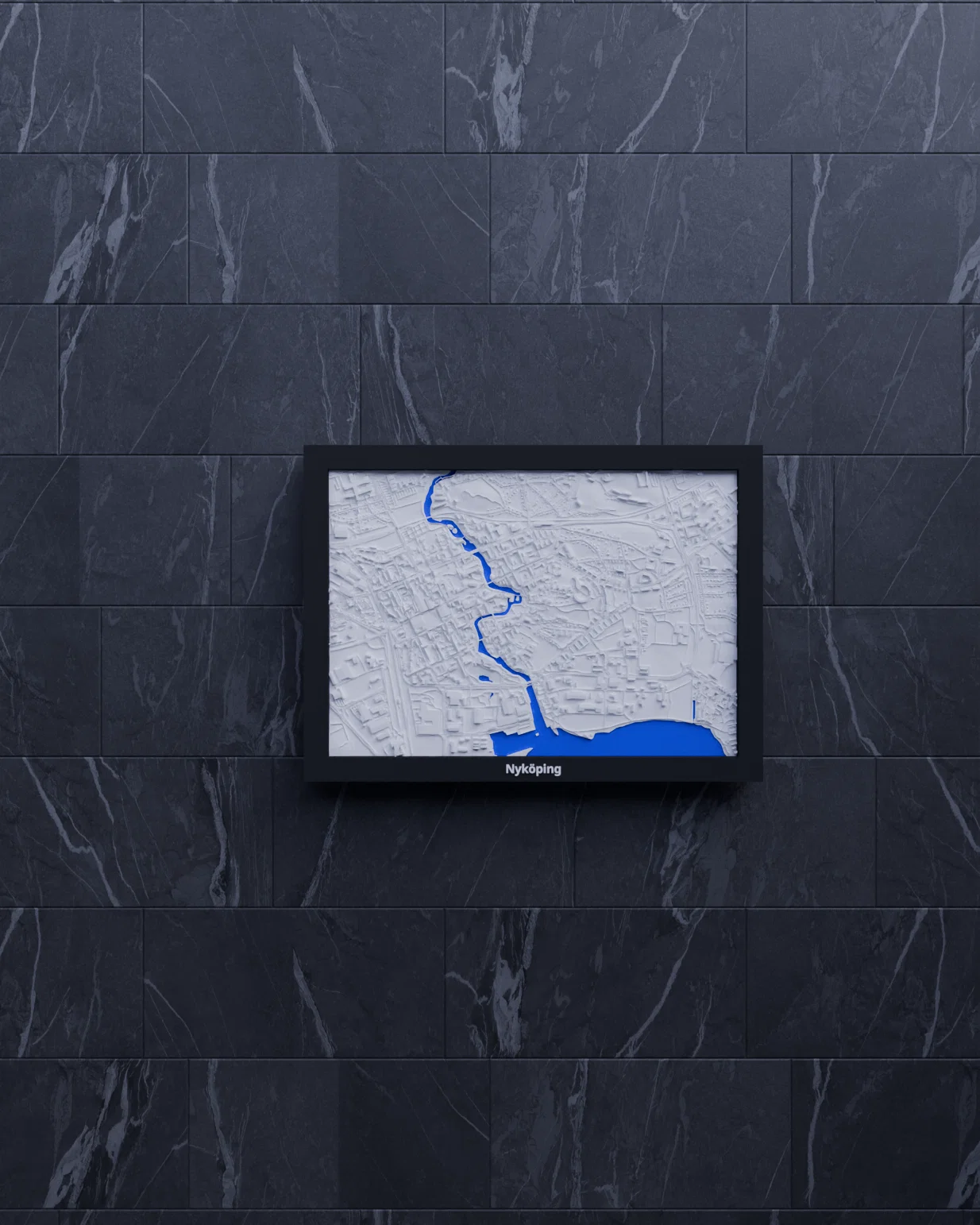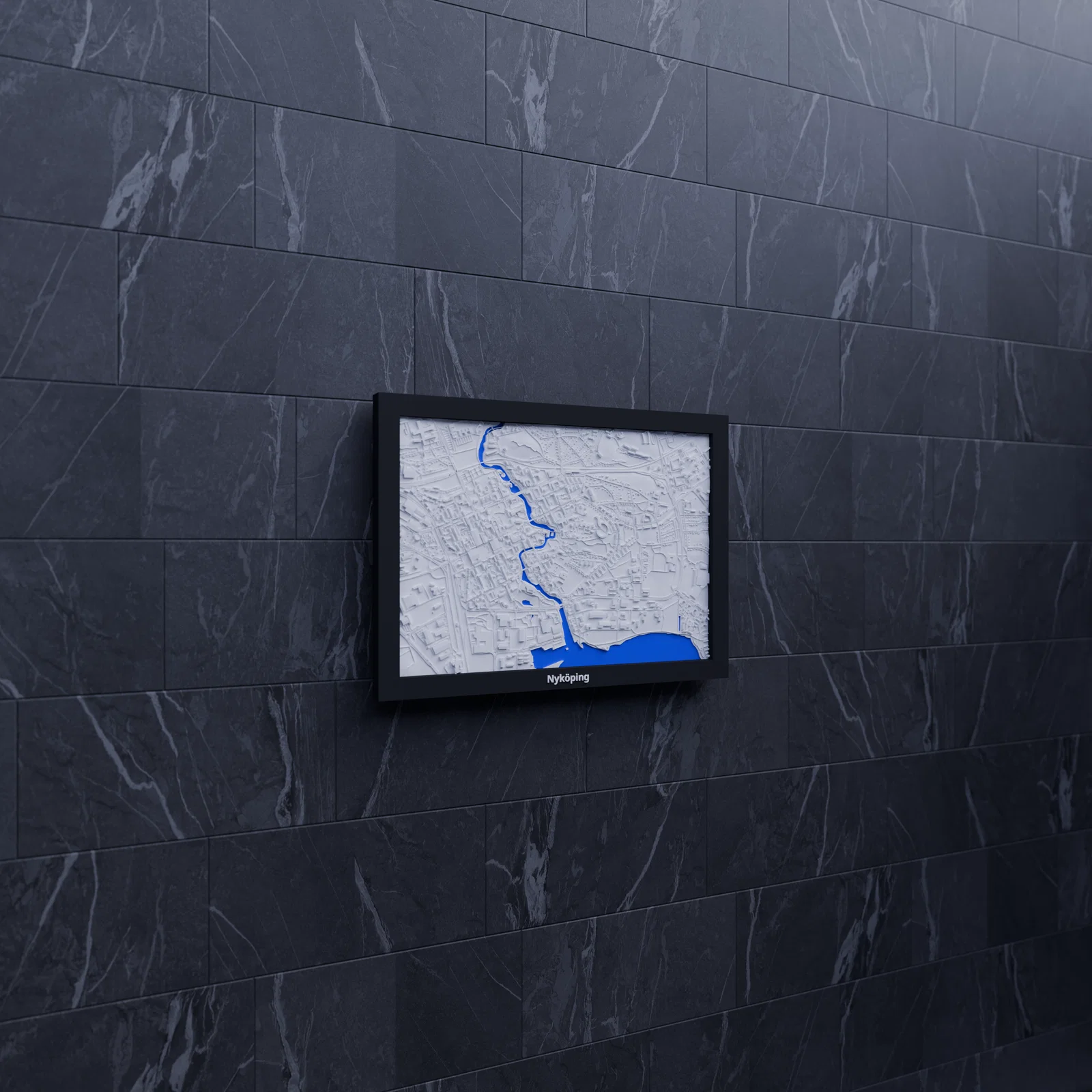 Bản thu nhỏ địa hình Nyköping (Thụy Điển) dựa trên dữ liệu địa lý thật, thu nhỏ khu vực 2.821 x 1.973 km thành model 170.5 x 119.5 mm. Có STL/3MF và nhiều khung (frame) kèm lỗ treo, hợp trưng bày, học tập hoặc làm quà.