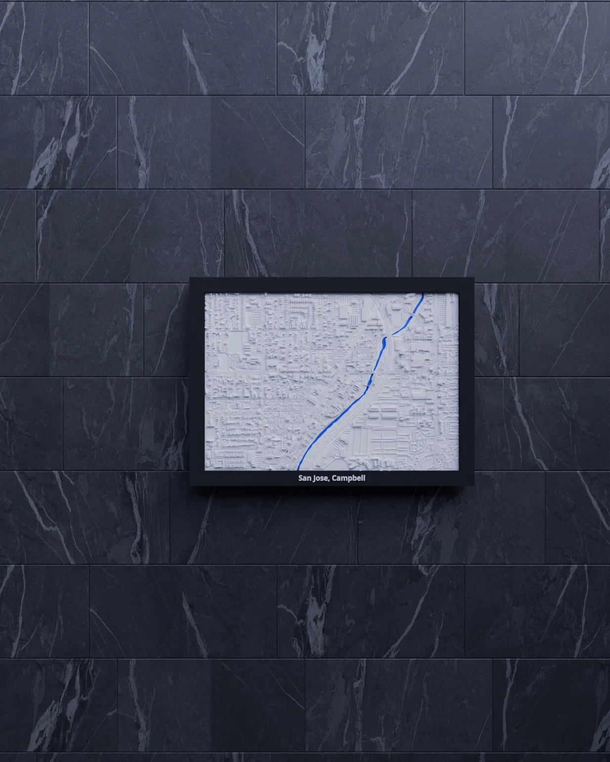Bản thu nhỏ địa hình in 3D tái hiện khu vực San Jose, Campbell (Hoa Kỳ) từ dữ liệu địa lý, tỷ lệ ~13718:1. Có STL/3MF, nhiều phiên bản khung, kèm profile tối ưu cho Bambu Studio và Snapmaker Orca.