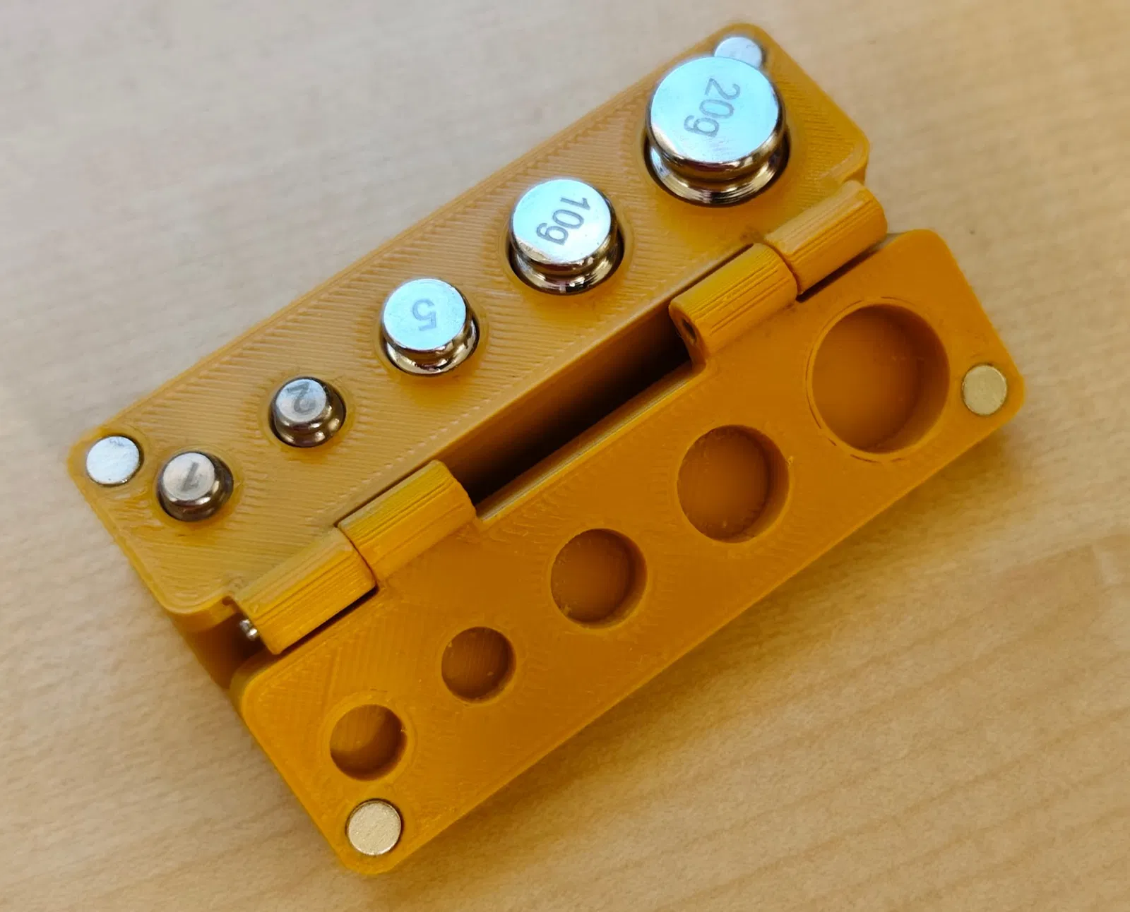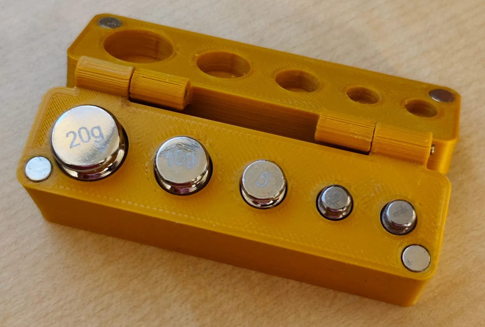 Hộp lưu trữ cho bộ quả cân hiệu chuẩn giá rẻ từ AliExpress (20-10-5-2-1g). Có thể dùng nam châm nhỏ (ví dụ từ Dexcom G7) để giữ nắp và dùng chốt 2 mm cho bản lề; in không cần support.