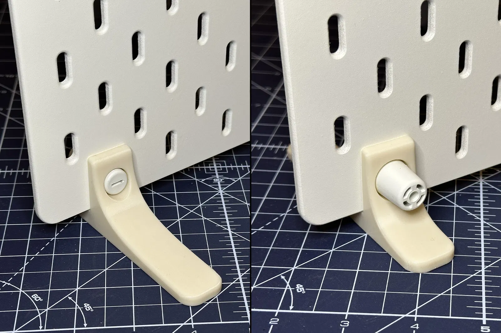 Bộ chân đế giúp bảng peg IKEA Skådis đứng độc lập bằng ngàm/ốc IKEA nguyên bản. Thiết kế dài 12,5 cm, phần trước 8 cm tăng độ ổn định, đáy phẳng có thể dán thêm foam mounting tape để chắc hơn.