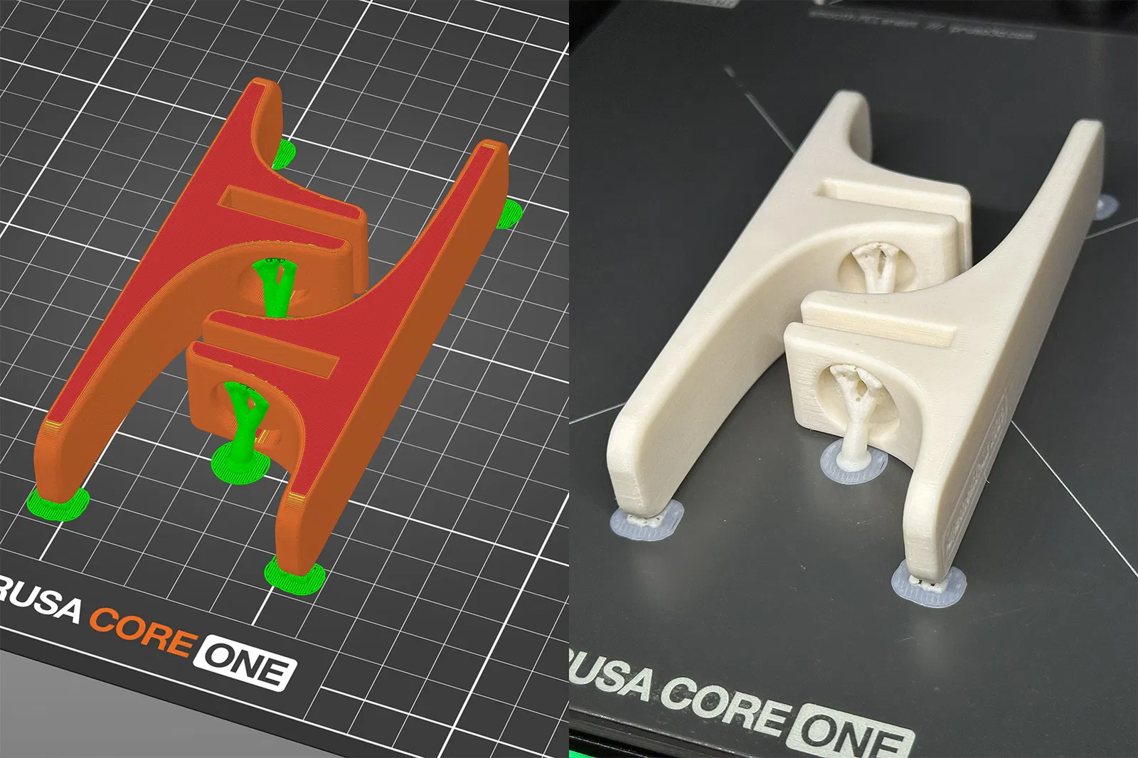 Mình in bằng Prusament ASA với chiều cao layer 0,2 mm, 4 perimeters / top / bottom layers, và 15% gyroid infill. Một cặp gồm 2 chân đế tốn khoảng ~45 g filament và mất 2,5 giờ để in.