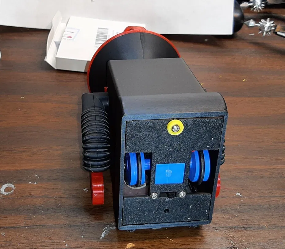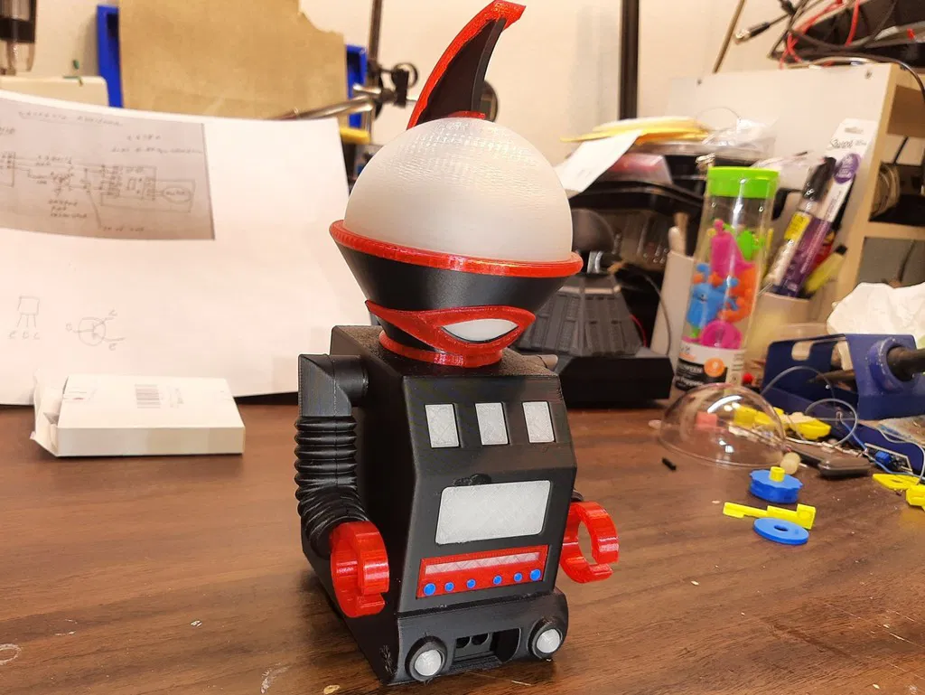 Mẫu robot đồ chơi in 3D có khả năng né vật cản: chạy tới, gặp vật phía trước thì tự chuyển motor sang chạy lùi để quay hướng. Thiết kế lấy cảm hứng từ tập “Hunters Moon” của Lost in Space (mùa 3).