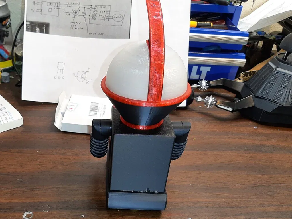 Dự án in 3D mới nhất của mình được xây dựng dựa trên một mạch điện tử mà RobotHut đã giới thiệu trong một video của anh ấy. Nó sẽ chạy thẳng tới cho tới khi phát hiện có vật ở phía trước, rồi quay hướng bằng cách chuyển motor sang chạy lùi. Một bánh xe có cơ cấu ly hợp (clutch) chỉ truyền động theo chiều tiến. Khi motor quay lùi thì bánh đó sẽ ngừng lại. Ngoại hình của món đồ chơi được lấy cảm hứng từ robot trong tập “Hunters Moon” của series “Lost in Space” mùa 3. Đây không phải là mô hình tái hiện chính xác con robot đó, mà chỉ mượn khá nhiều ý tưởng thiết kế. Mình làm lại phần cơ khí từ đầu, còn chi tiết về phần điện tử thì xem ở link Robothut.