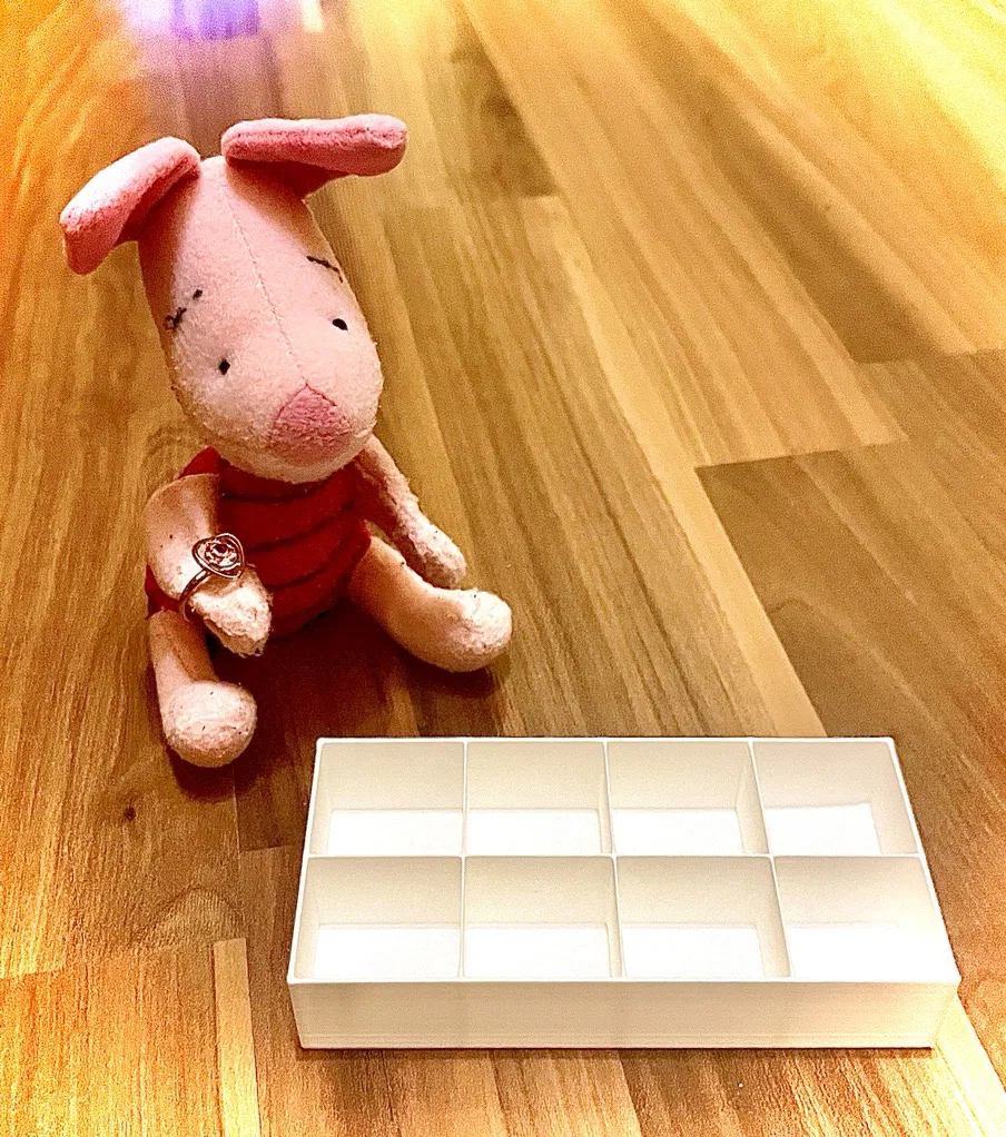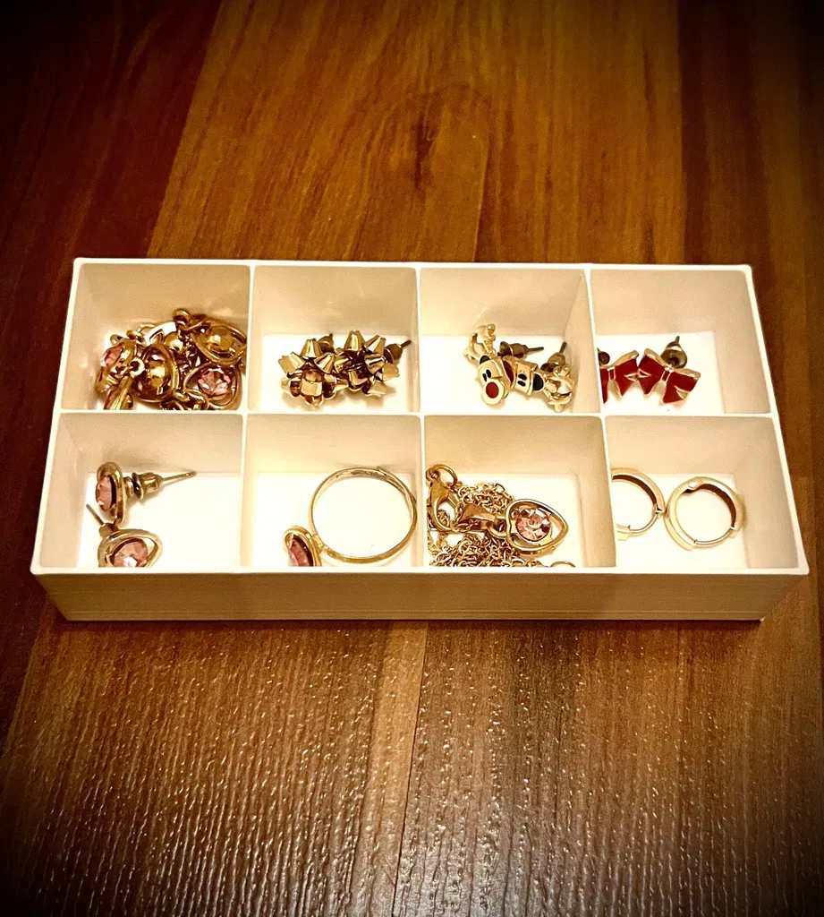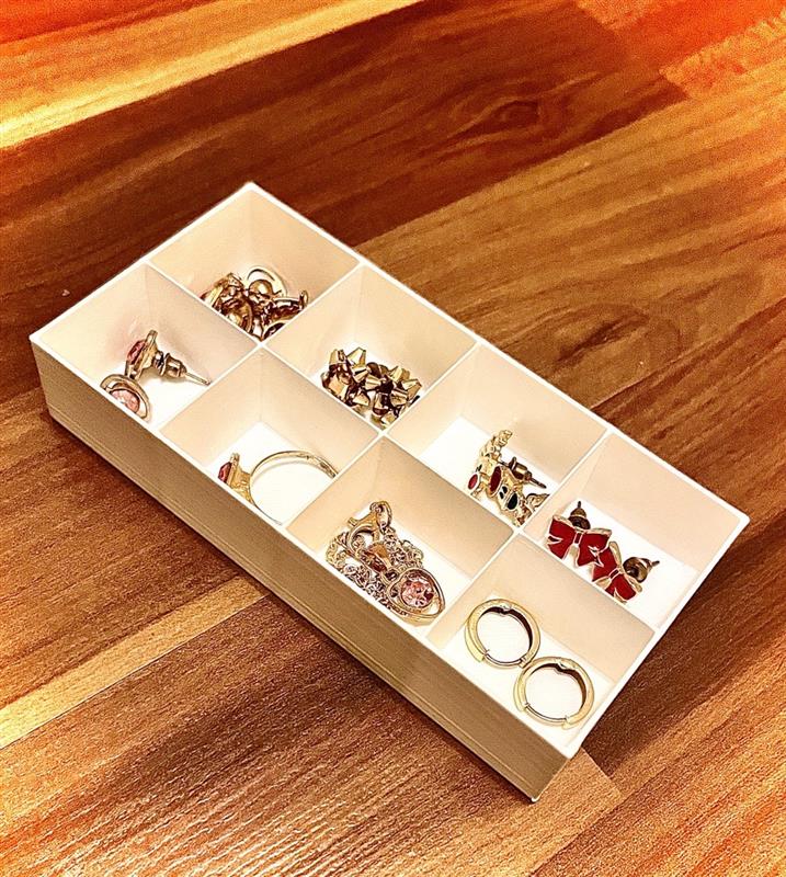 Khay đựng trang sức mini nhỏ gọn, dùng để để vòng tay, bông tai, nhẫn và nhiều món trang sức khác. Kích thước cao 22 mm, dài 114.61 mm, rộng 56.85 mm; thời gian in khoảng 30–35 phút.