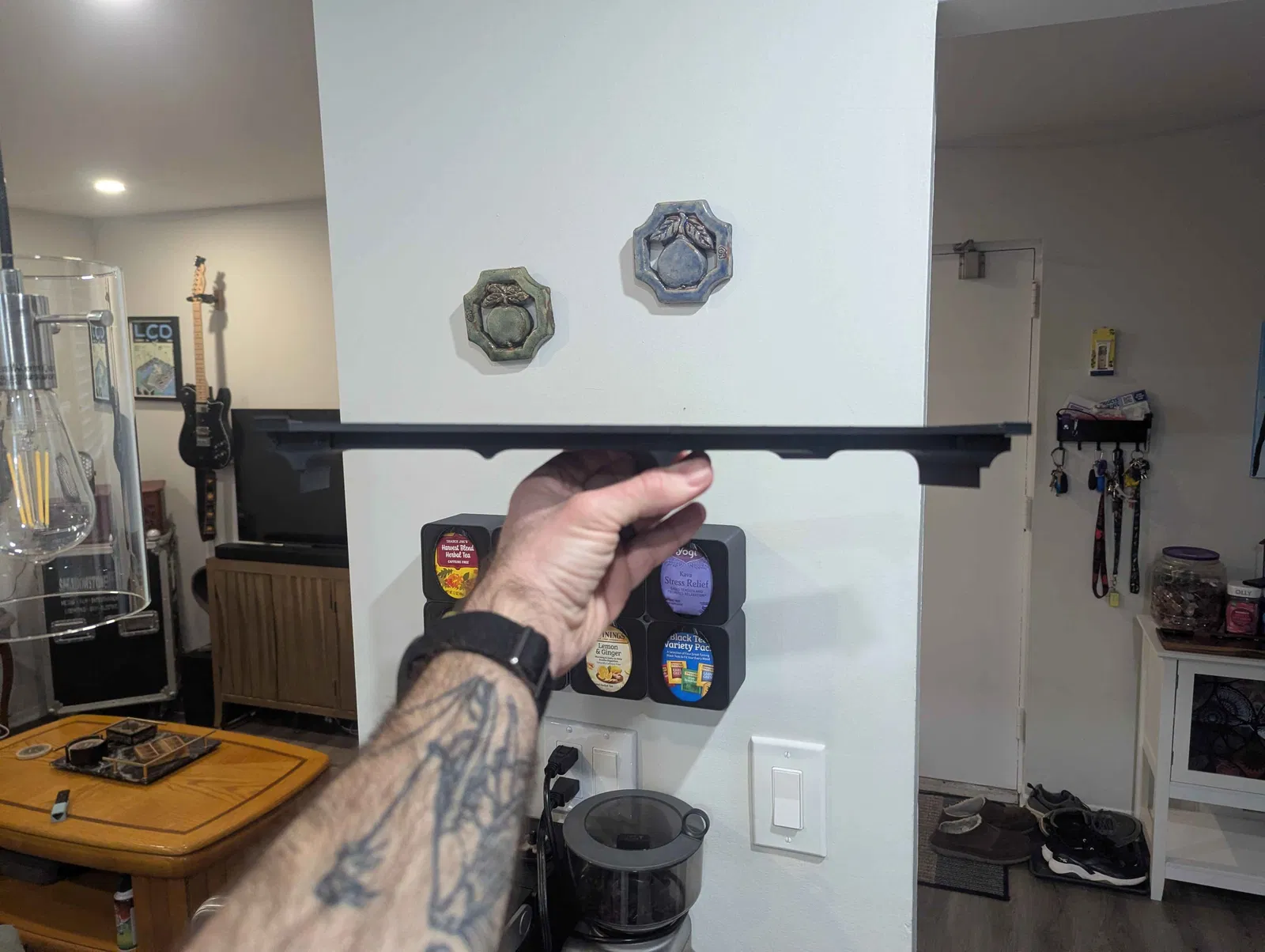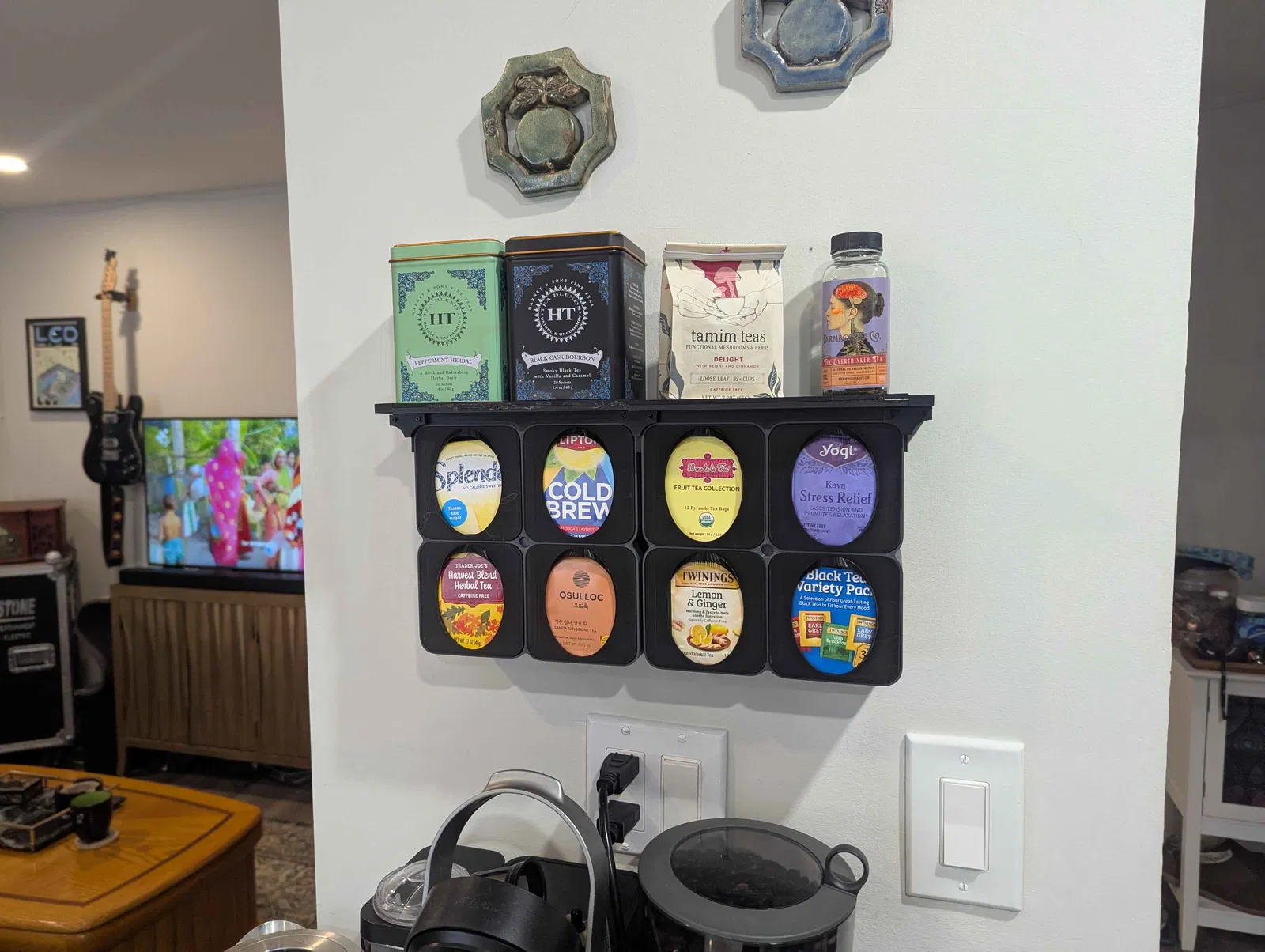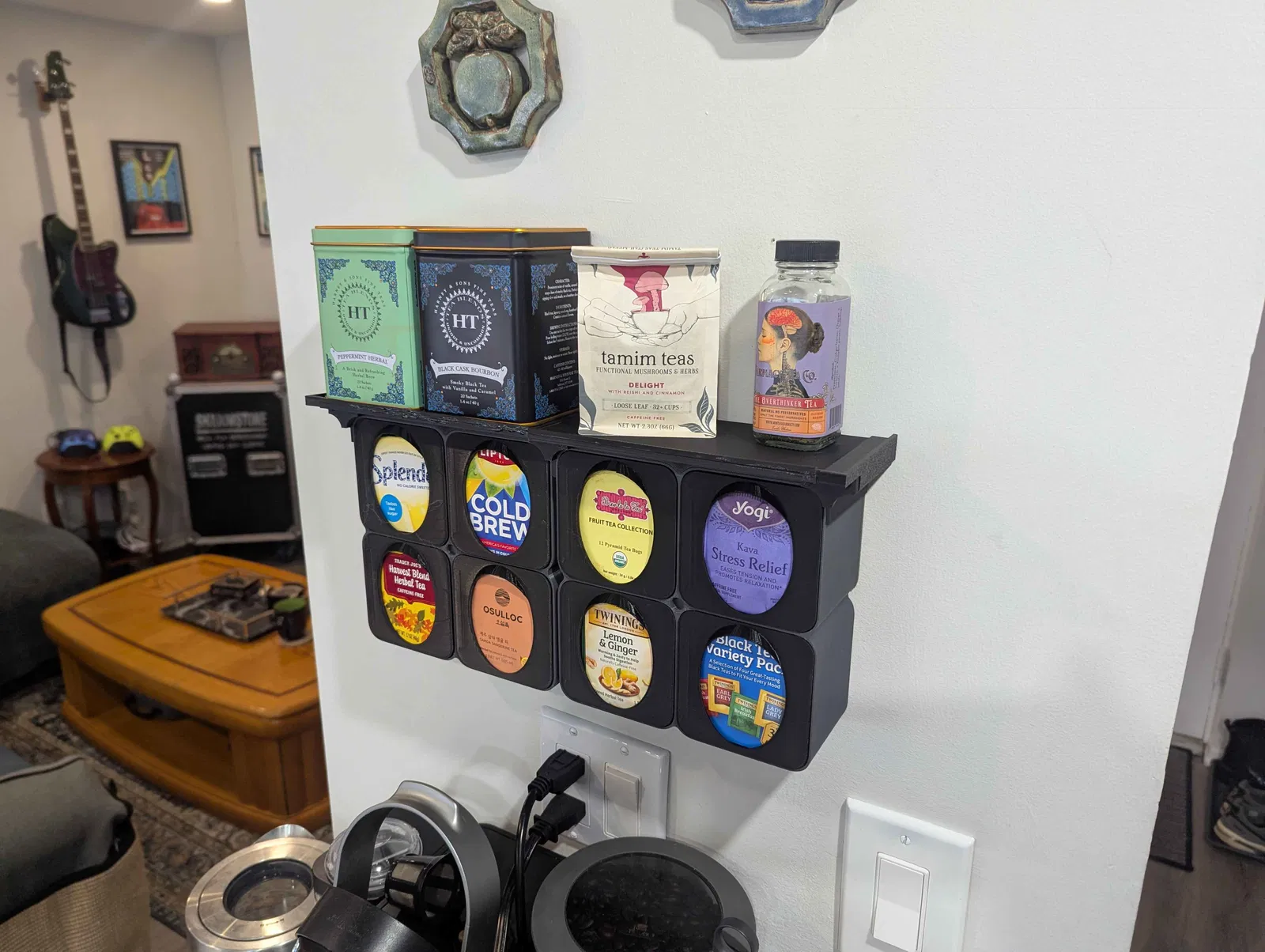 Vợ chồng mình rất mê in và dùng hệ MULTEA để cất đủ loại túi trà, nhưng lại nhận ra không có chỗ để đặt mấy hộp thiếc hay chai đựng trà lá rời. Dựa trên mẫu gốc làm “khuôn”, mình thiết kế thêm một hệ kệ đặt gọn gàng phía trên, đồng thời còn dùng để nối nhiều khay MULTEA lại với nhau thành một hàng.