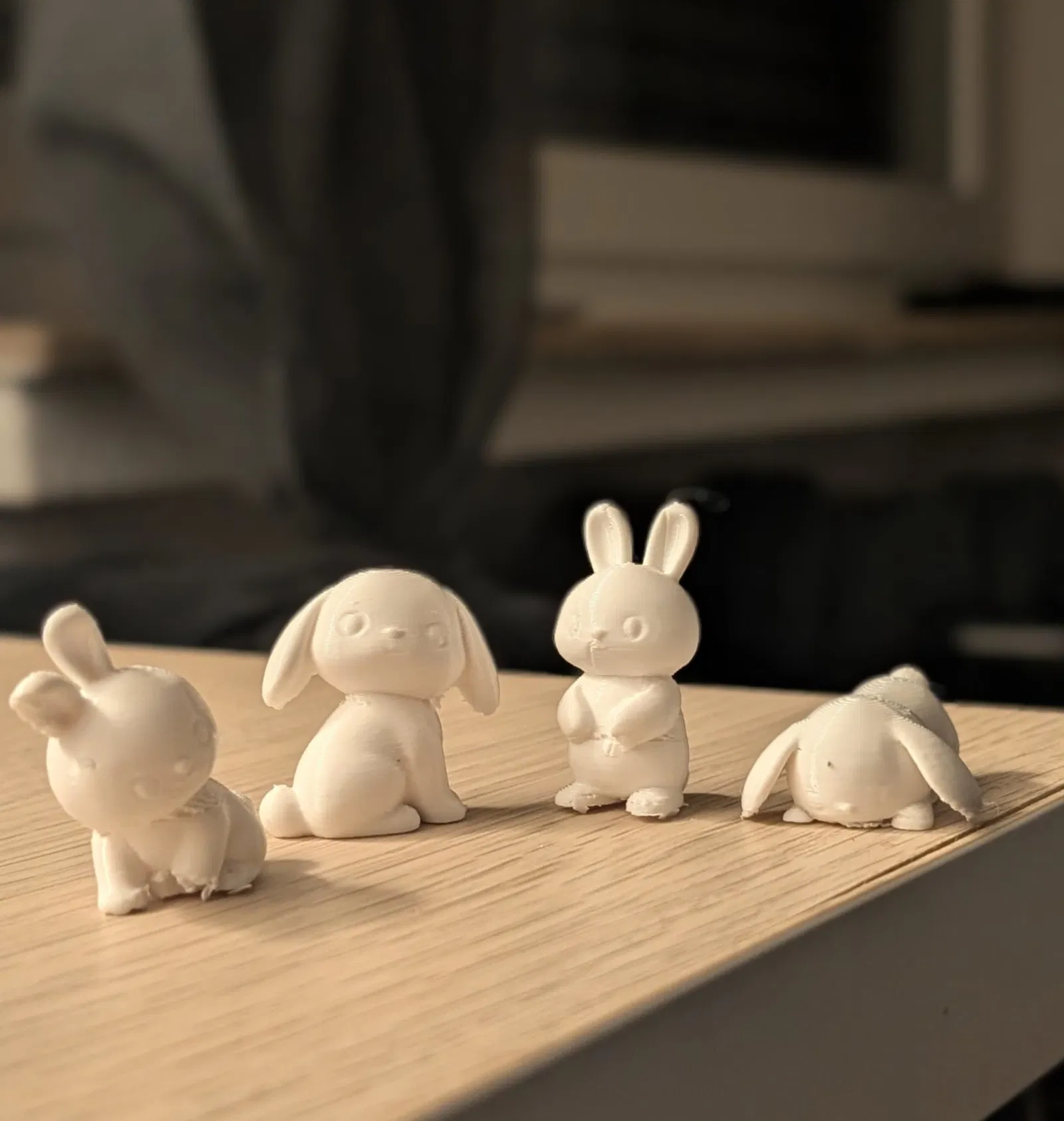 Bộ sưu tập thỏ mini này gồm 4 mẫu thỏ khác nhau, mỗi mẫu có một dáng và “tính cách” riêng. Cả bộ được làm theo cùng phong cách dễ thương như bộ mèo mini của mình – tối giản, bo mềm và rất hợp để làm đồ trang trí nhỏ hoặc quà tặng.