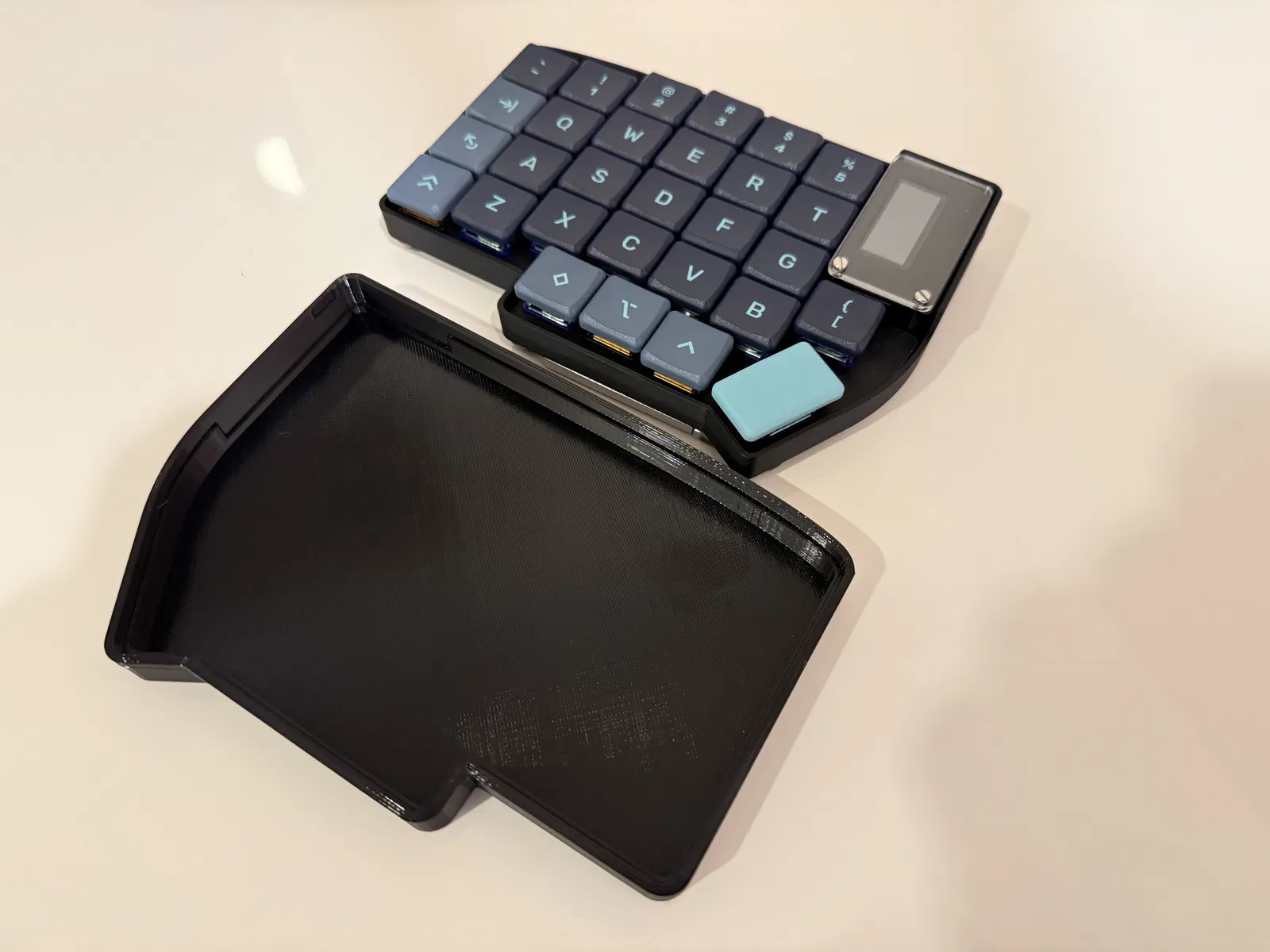 Travel case cho bàn phím split Lily58 từ typeractive.xyz dùng low profile choc switches. Ốp trượt chụp từ trên xuống, không cần ngàm. Thiết kế gờ trong tránh chạm phím và màn hình nice!view; nhớ mirror để in bên kia.