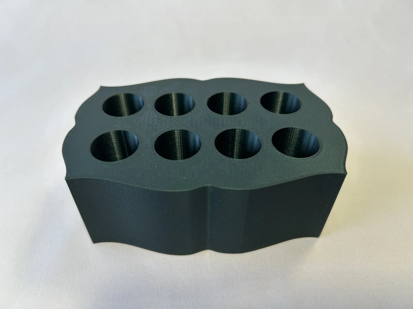 Mẫu giá đỡ cho chai Essential Oil dạng roller ball của Saje, thiết kế tối ưu để in trên máy in 3D dùng single filament. Phù hợp để cất gọn, trưng bày và giữ chai tinh dầu đứng vững.