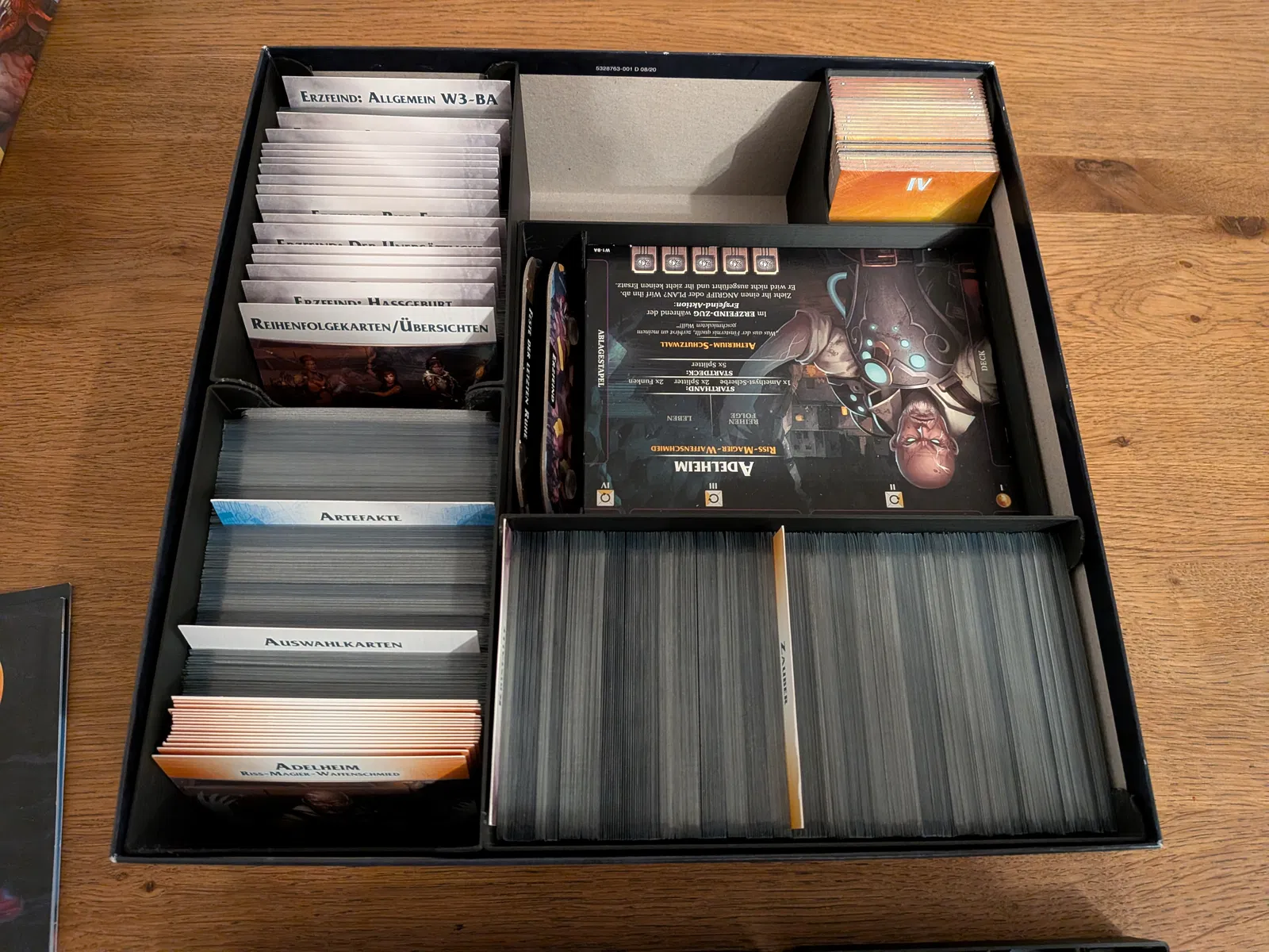 Insert đơn giản cho Aeon's End, đã test với hộp bản tiếng Đức 29×29 cm. Chứa được base game, phần chơi lại của Aeon's End: Legacy và expansion War Eternal, với nhiều ngăn dùng chung cho các expansion khác.