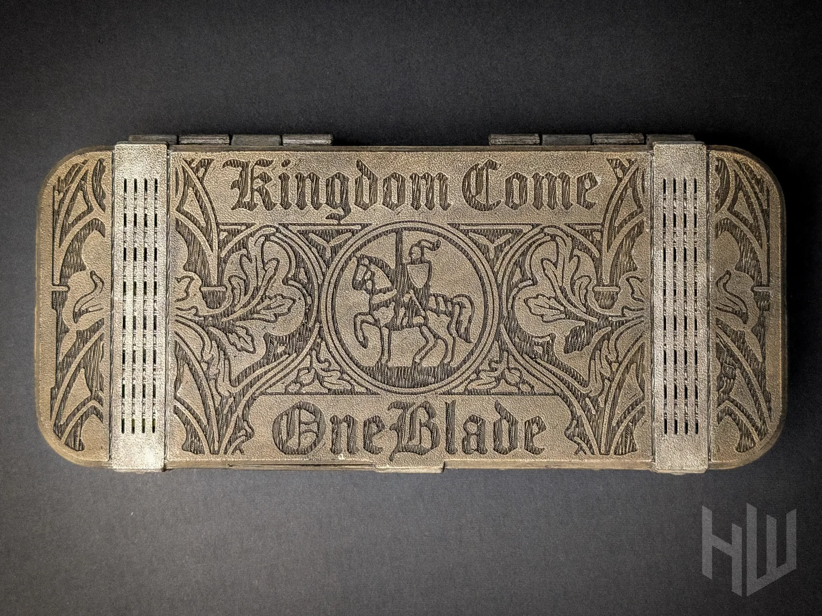 Hộp đựng du lịch lấy cảm hứng Kingdom Come: Deliverance II cho Philips OneBlade 360 QP4631/65. Fully print-in-place, không cần support hay lắp ráp, chứa tay cầm, 2 lưỡi, phụ kiện và kẹp cáp, có lỗ thoát ẩm.
