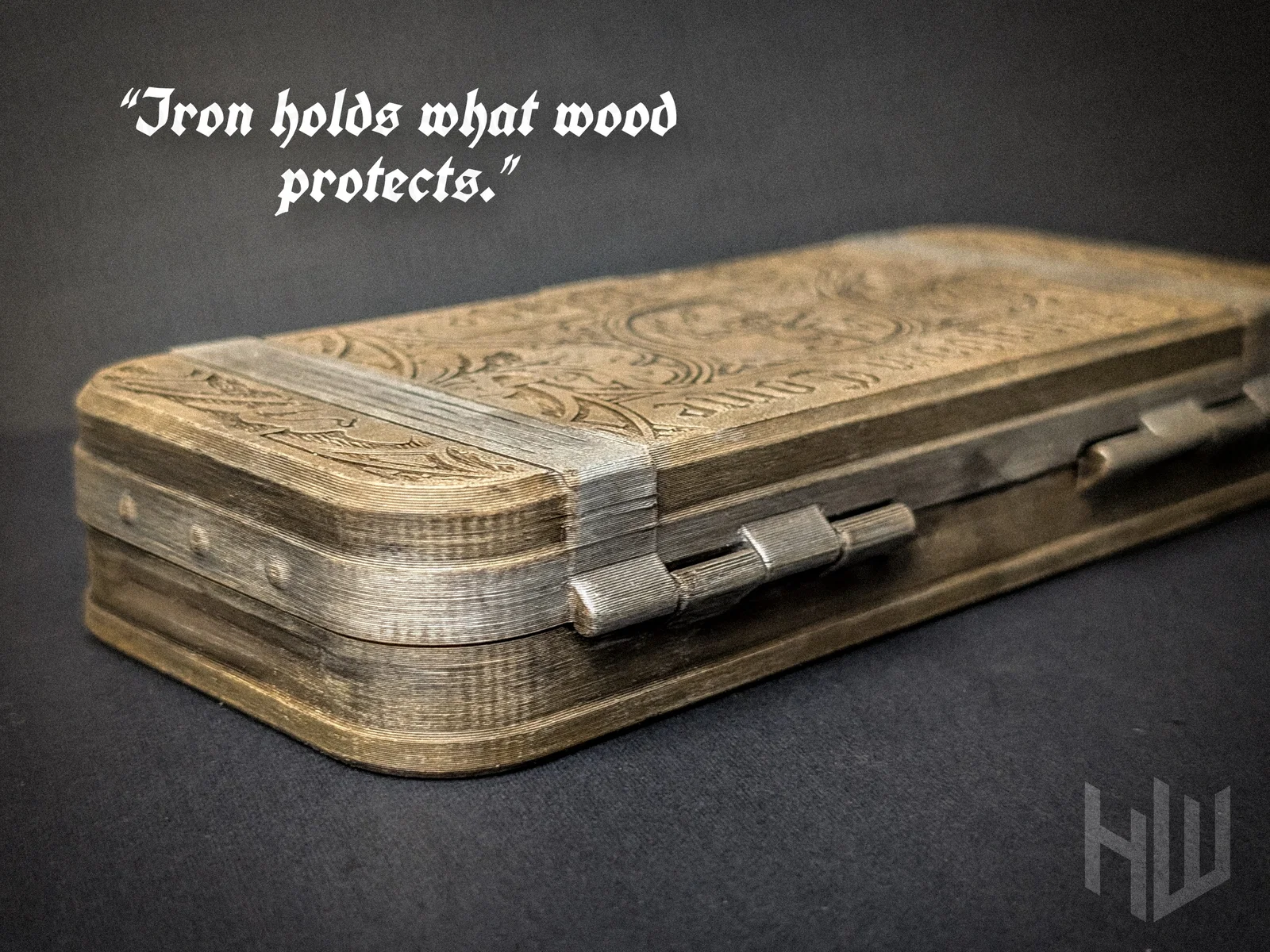 Ảnh bìa cho thấy hộp được sơn tay theo phong cách gỗ và sắt thời trung cổ; phần dưới sẽ nói kỹ hơn.
