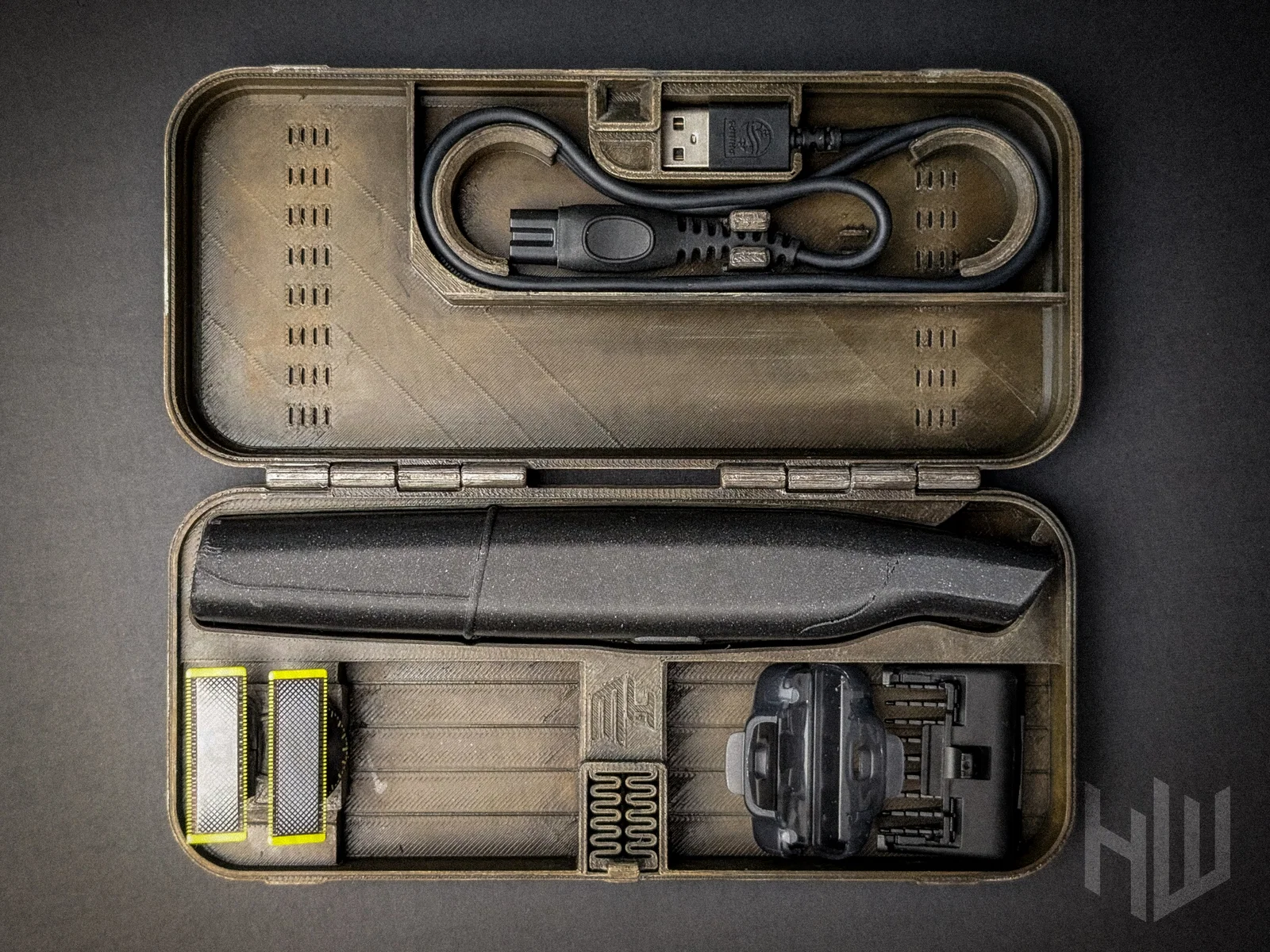 Thiết kế lại từ đầu dựa trên cơ cấu đã được kiểm chứng từ các đời trước trong series hộp compact. Bên trong, hộp chứa vừa tay cầm OneBlade, 2 lưỡi trong các khe riêng, 2 ngăn cho phụ kiện gắn thêm, và một ngàm giữ cáp dạng “precision” được tinh chỉnh qua nhiều lần lặp. Hai lỗ thoát khí trên nắp giúp hơi ẩm thoát ra sau khi dùng; chúng được tích hợp vào chi tiết “thanh kim loại” bên ngoài nên nhìn như chìm hẳn vào thiết kế.